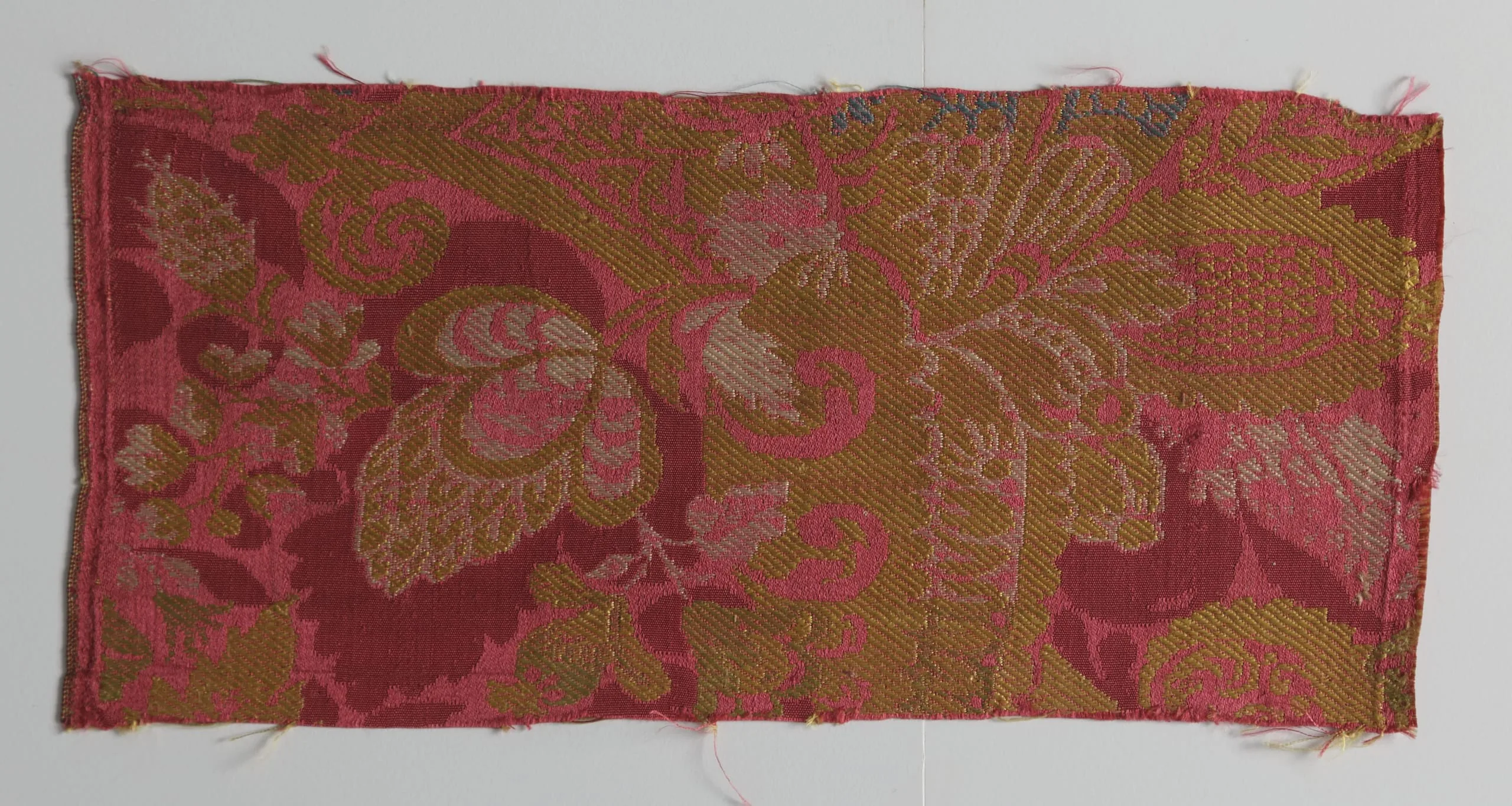 Horizontal woven silk textile fragment with large crimson and golden amber botanical motifs — scrolling leaves and stylized flowers — on a frayed-edge panel