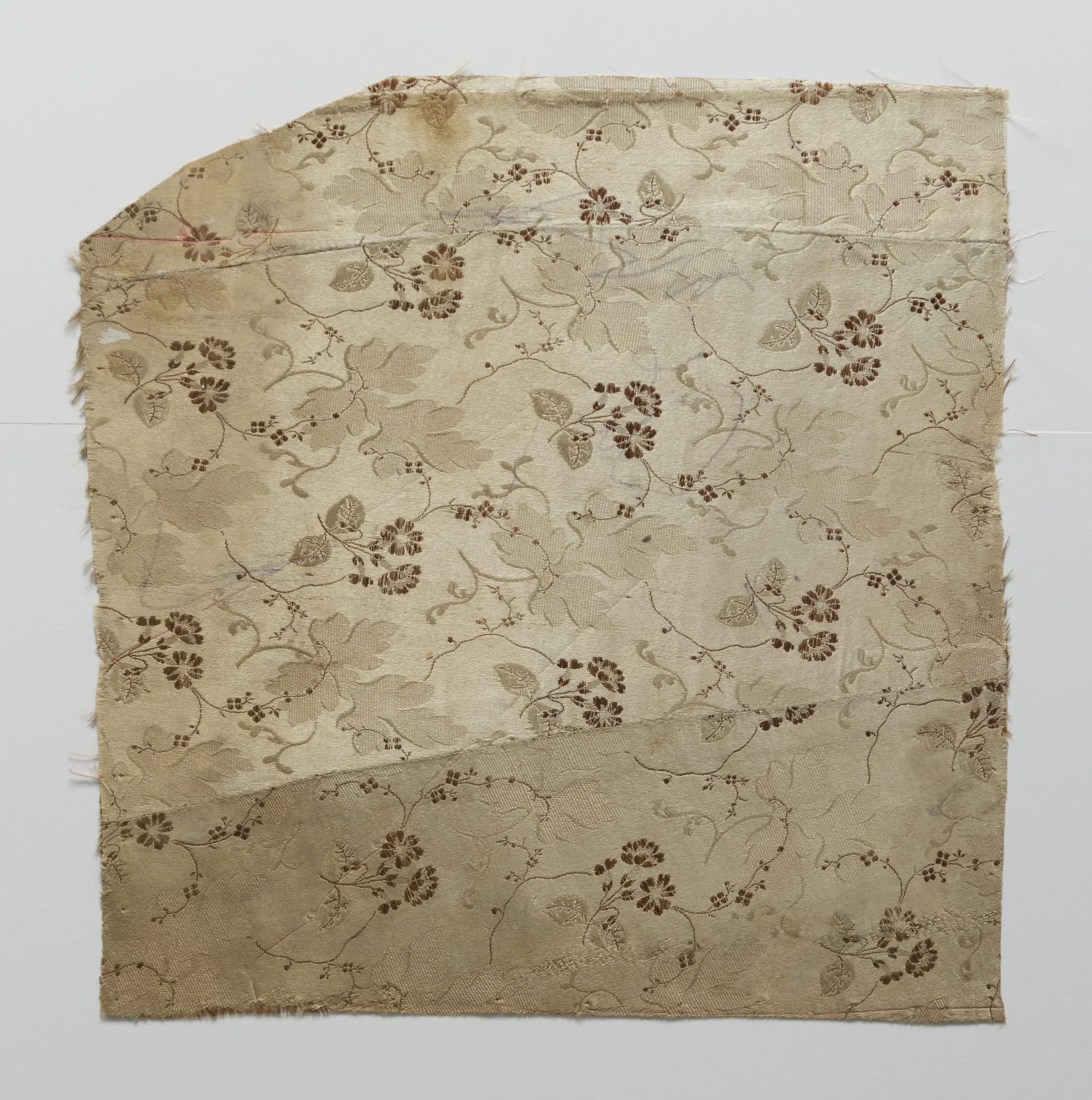 Woven silk textile fragment in ivory and pale gold with an allover repeating pattern of chestnut brown scrolling vines, five-petaled flowers, and heart-shaped leaves; frayed edges throughout
