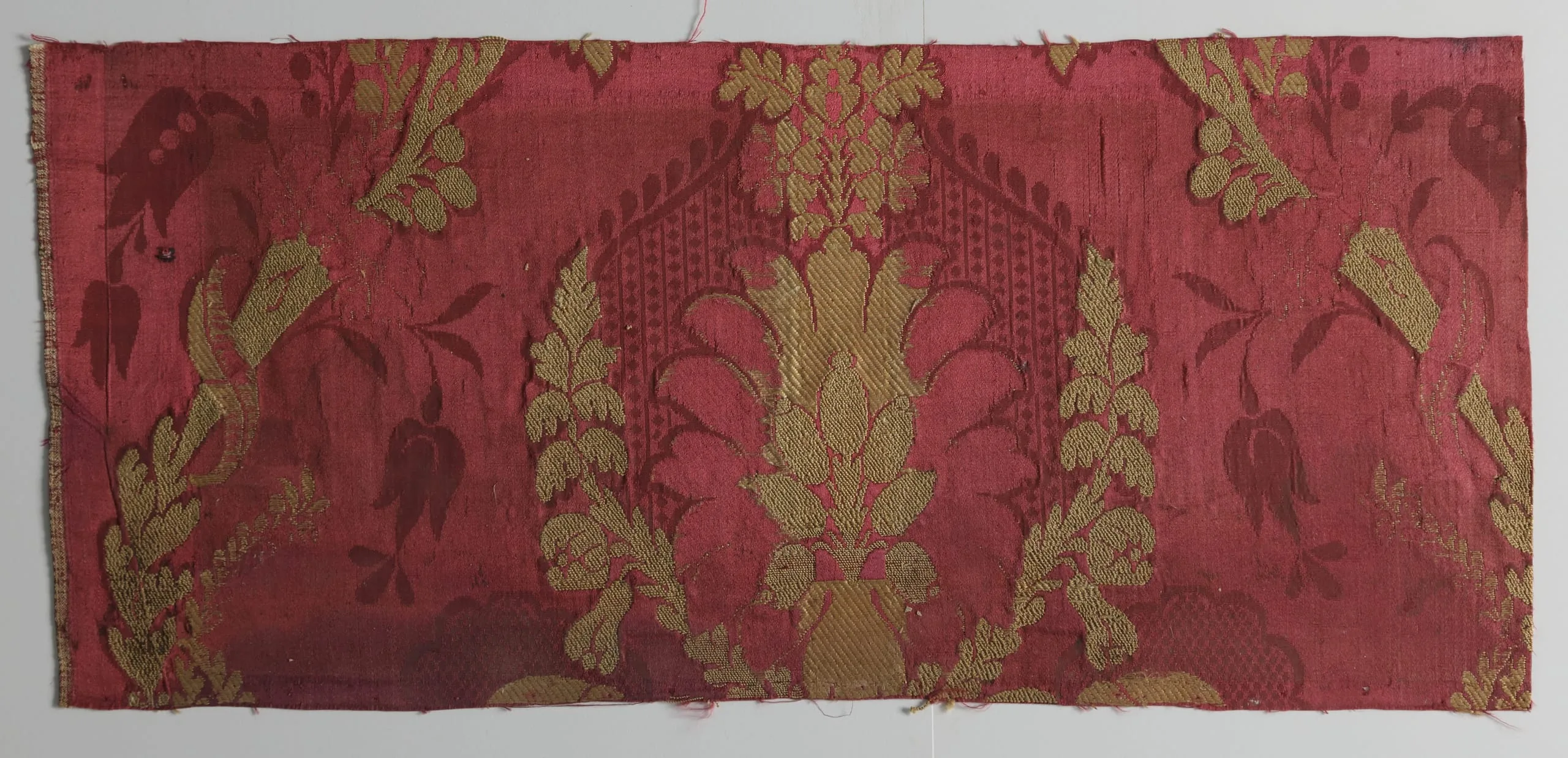 - Silk satin and plain weave (damassé) with metallic-thread supplementary-weft patterning bound in twill