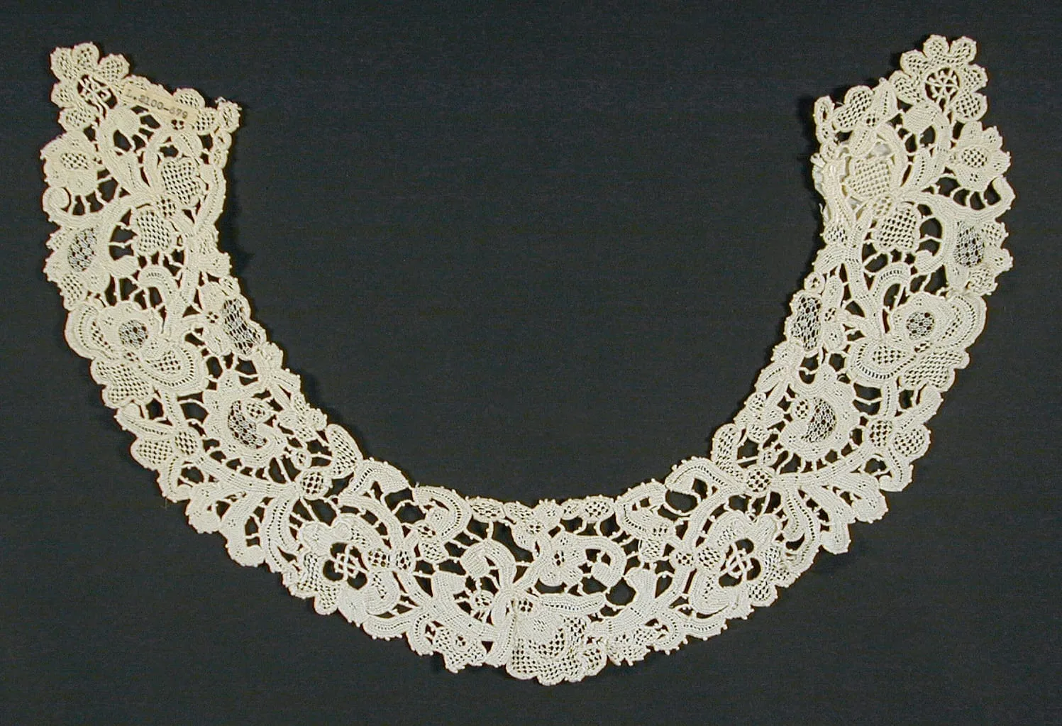 Ivory lace collar laid flat, U-shaped with repeating floral and foliate motifs in raised threadwork against an open mesh ground