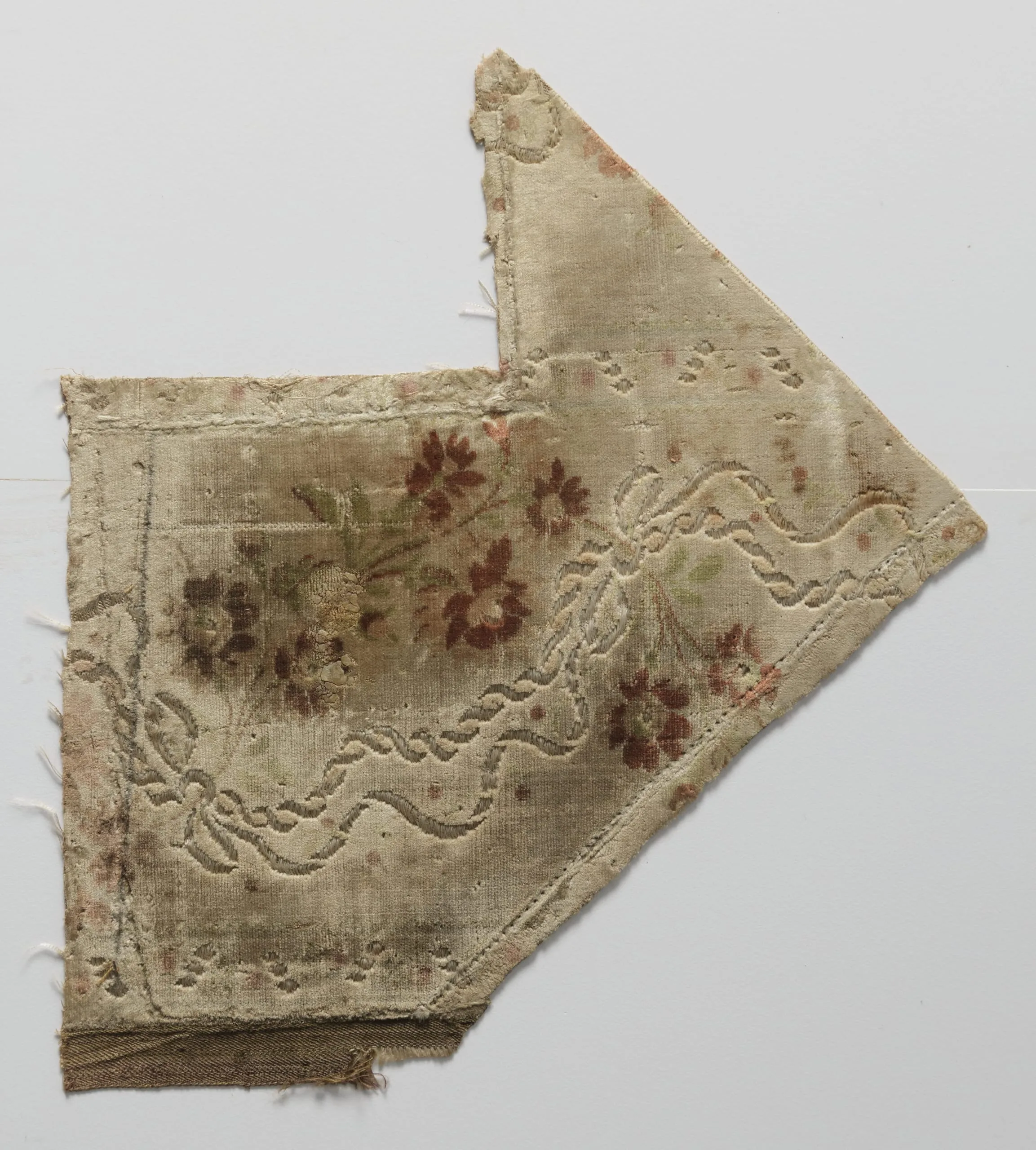 Arrow-shaped textile fragment in aged ivory fabric with woven ribbon motif and scattered crimson floral clusters, edges frayed