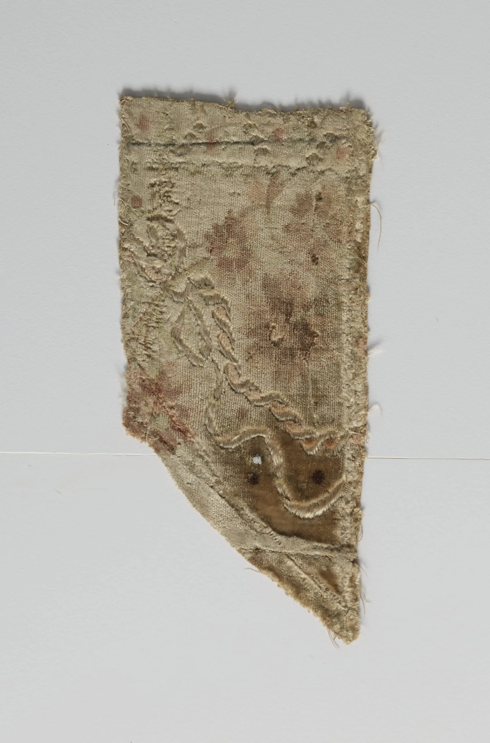 Fragmentary textile piece in aged ivory and parchment tones with frayed edges, rust-brown staining, and a low-relief figural woven or embroidered pattern