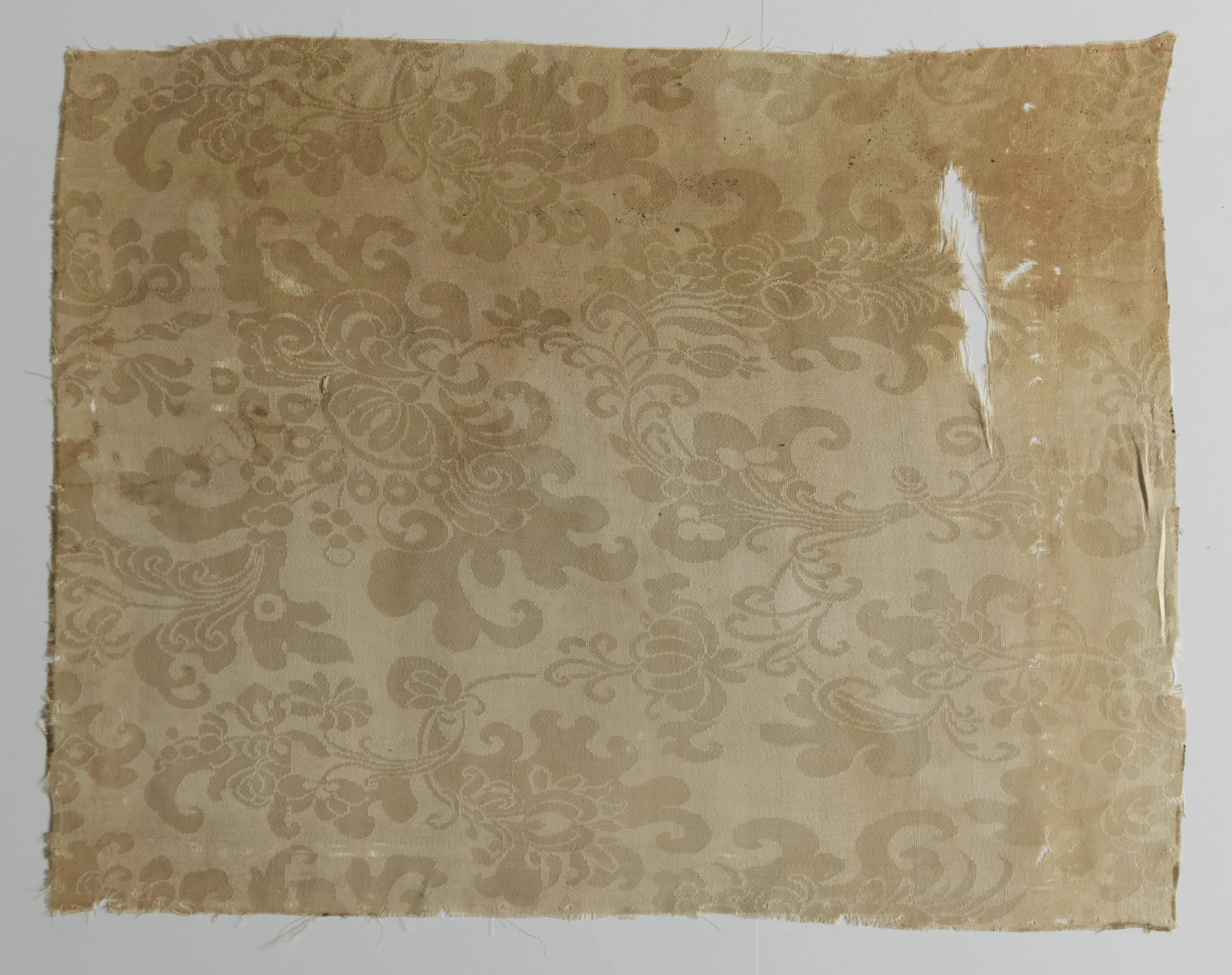 Horizontal damask textile fragment in pale wheat and parchment tones, with an allover repeat pattern of scrolling acanthus leaves, stylized flowers, and curling tendrils; frayed edges and age discoloration visible