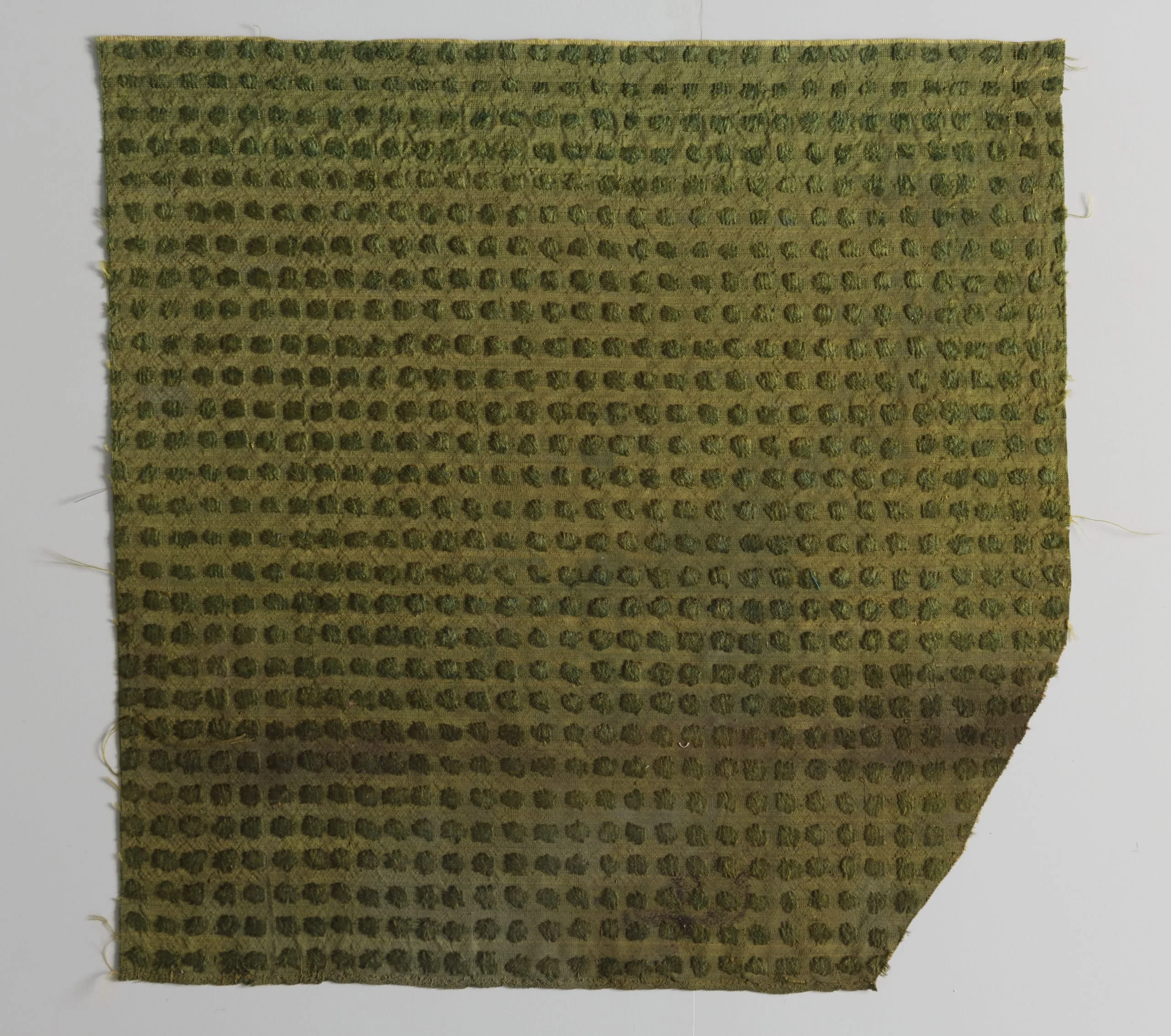 Textile fragment in olive and forest green with an allover raised dot pattern in a waffle weave structure, unfinished frayed edges, and a clipped lower right corner