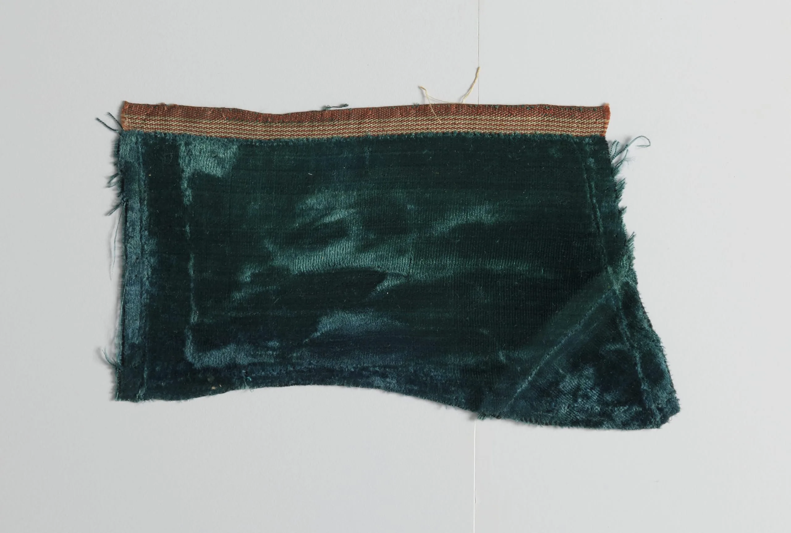 Textile fragment with a rust-orange woven border at top and deep teal-green velvet or cut-pile body, frayed edges, suspended by a thin thread against a white wall