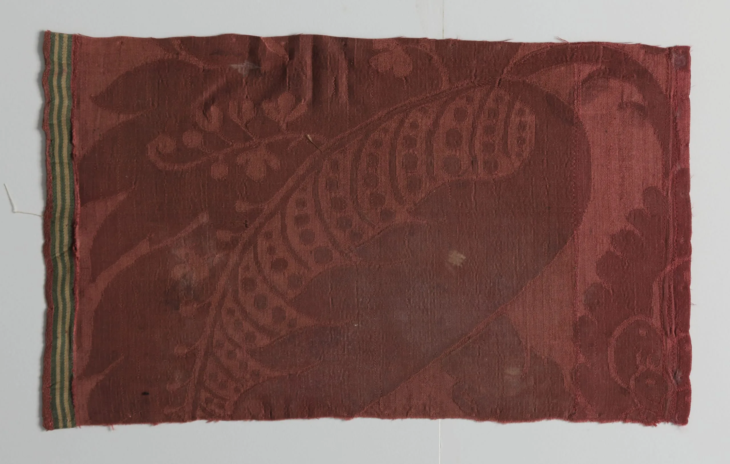 Horizontal damask textile fragment in brick red with tone-on-tone botanical pattern of curving fronds, a large scale-like pod form, and floral motifs; narrow green selvage stripe along the left edge