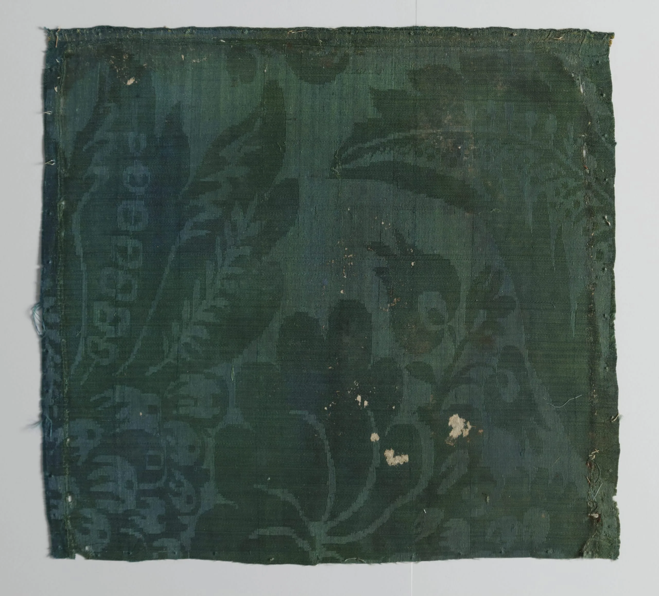 Square silk damask textile fragment in deep teal and forest green with a large-scale allover pattern of flower heads, broad leaves, and feathery fronds; edges are frayed with scattered areas of surface loss