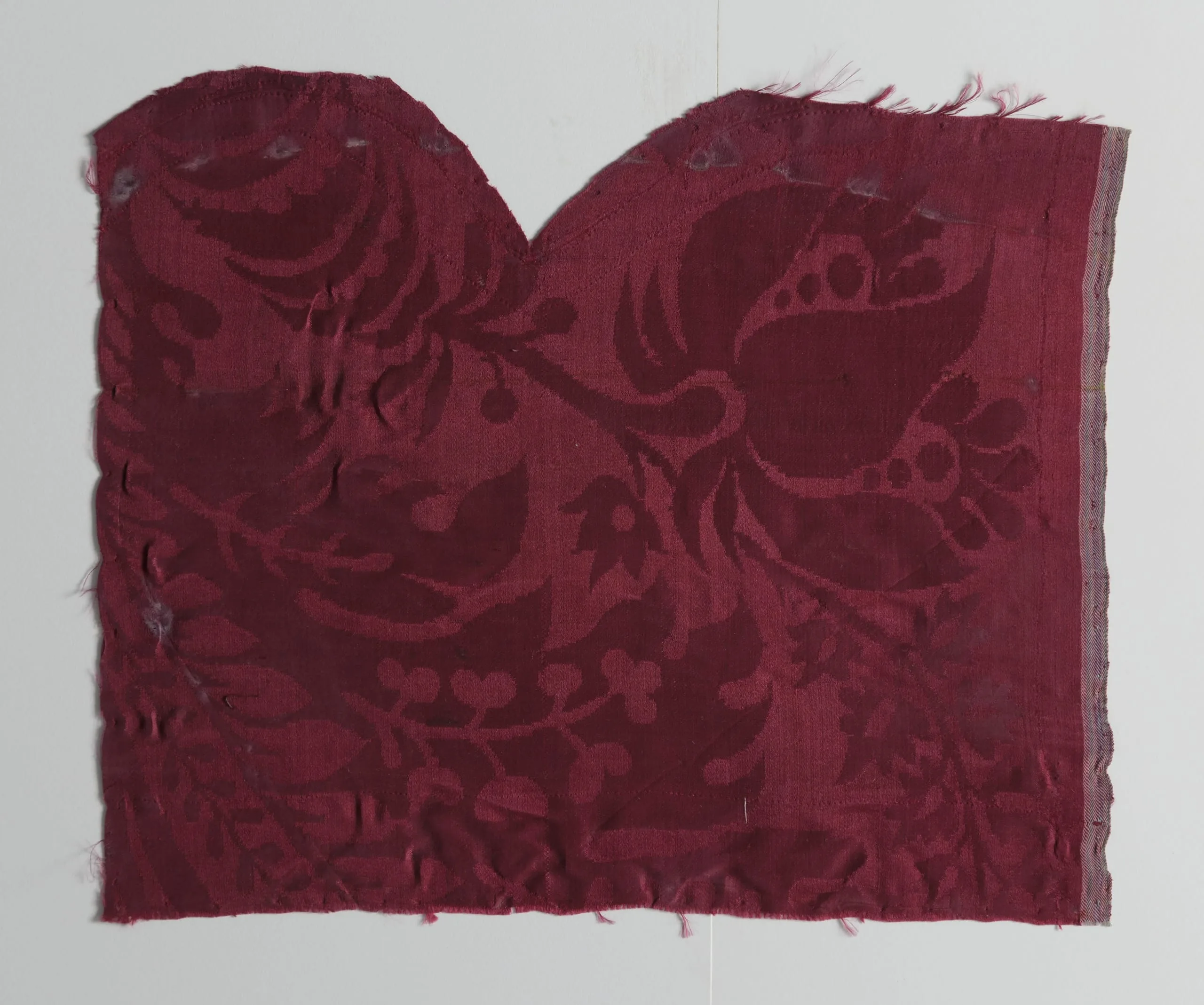 Crimson red damask textile fragment cut into a double-lobed shape, with an allover woven pattern of scrolling leaves, stylized blossoms, and berry clusters in contrasting matte and sheen finishes