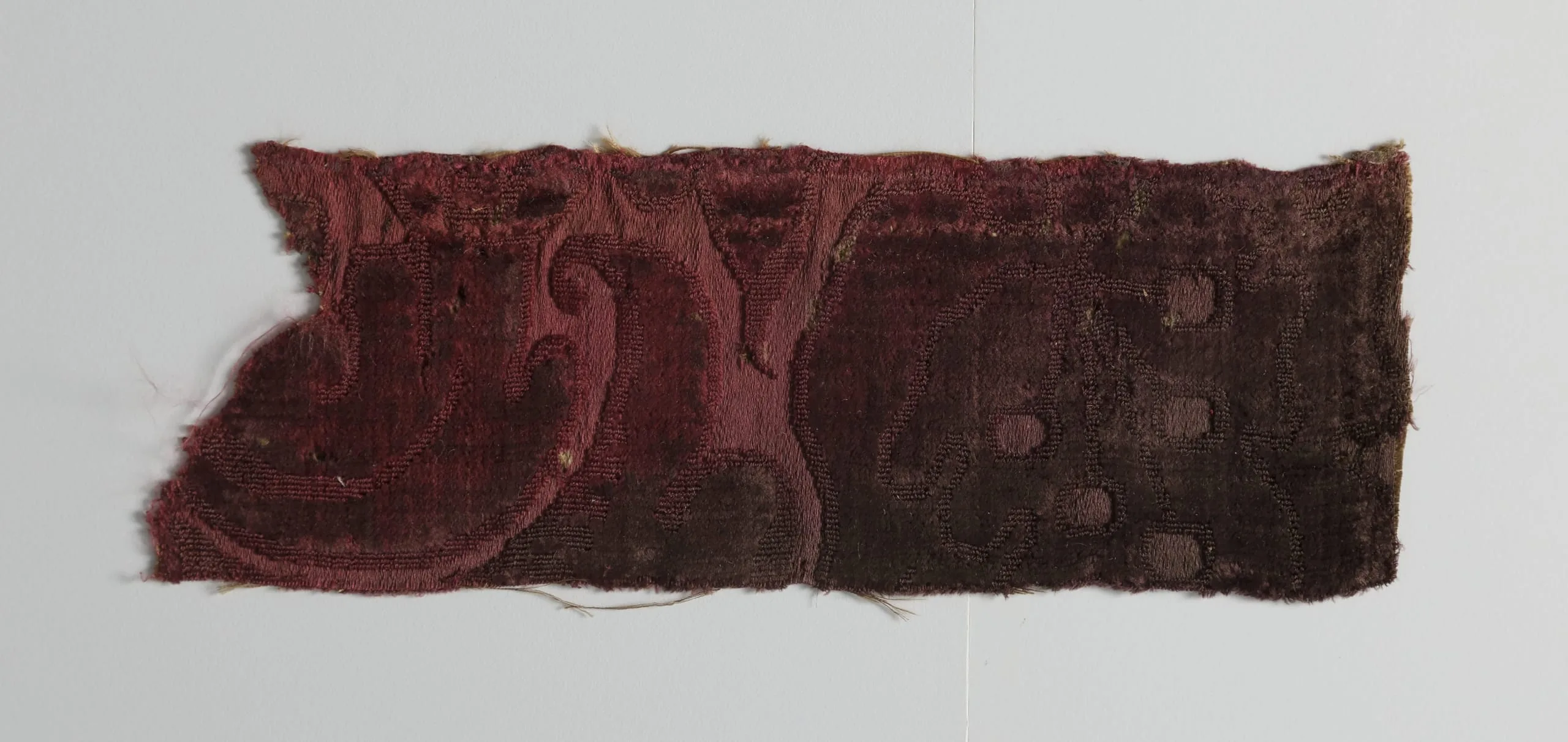 Fragment of cut-velvet textile in crimson and dark brown, with a large scrolling vessel motif on the left and a dotted pattern on the right, with frayed edges throughout