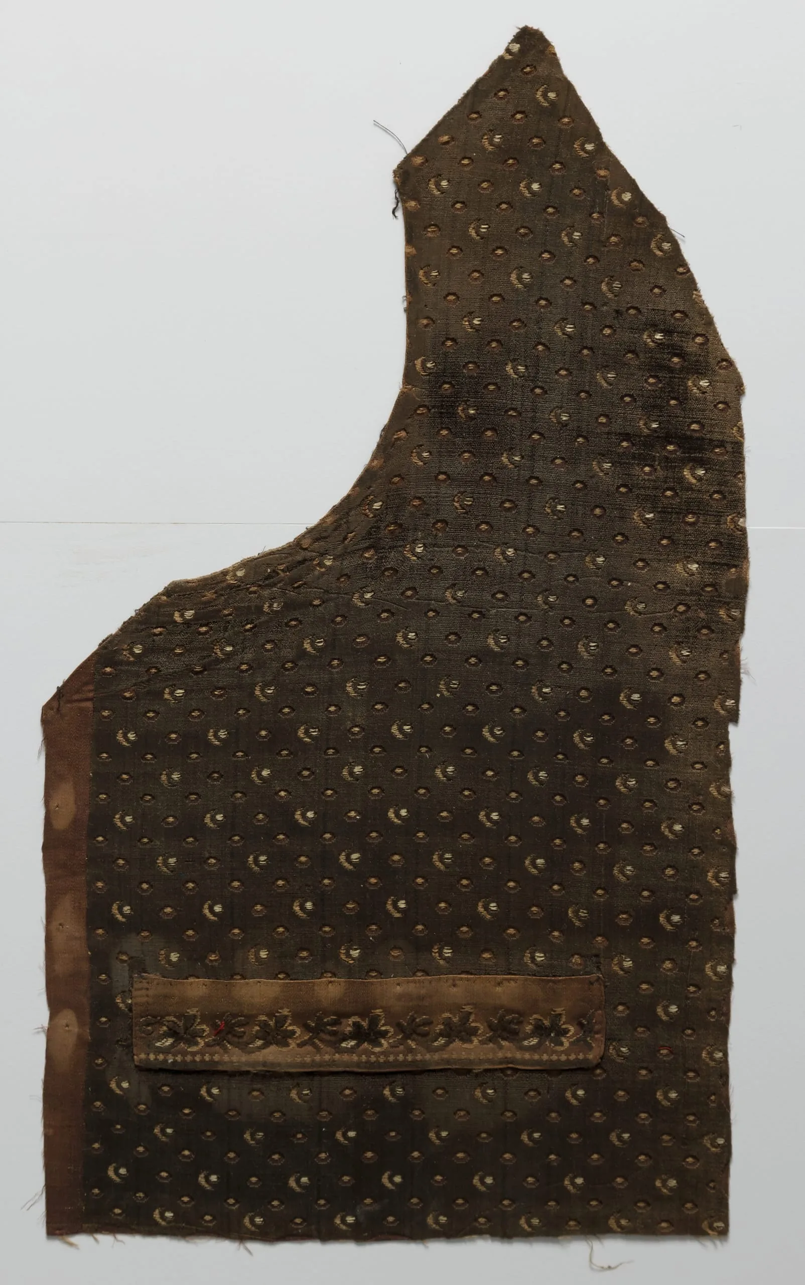 Textile fragment in deep brown with an allover gold crescent-and-oval pattern, featuring a horizontal embroidered floral band near the lower edge and frayed borders