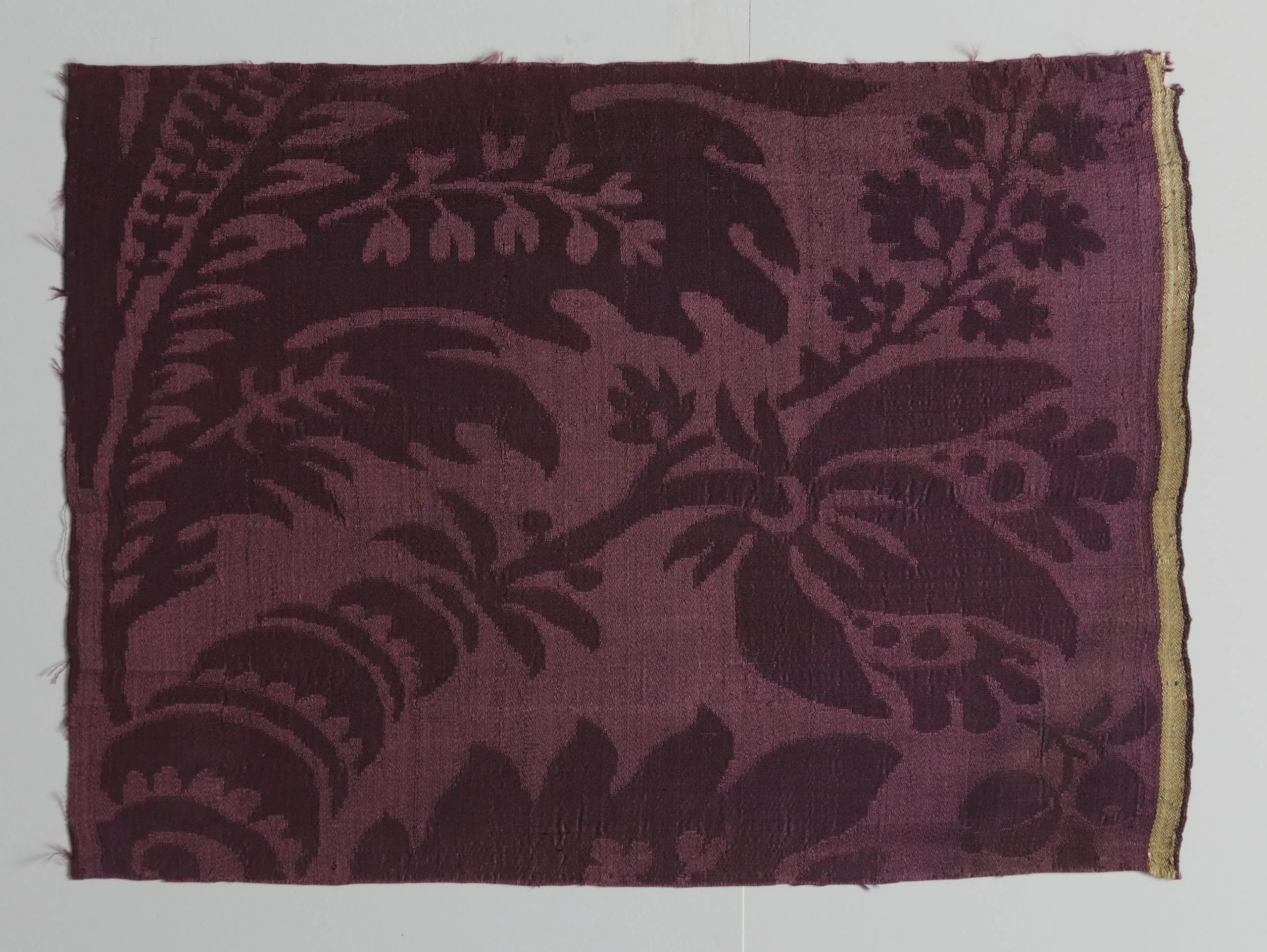 Horizontal silk damask textile fragment in two-tone deep plum-purple, with a large repeating pattern of fern fronds, broad flowers, a butterfly, and a spiral shell; narrow straw-yellow selvedge along the right edge