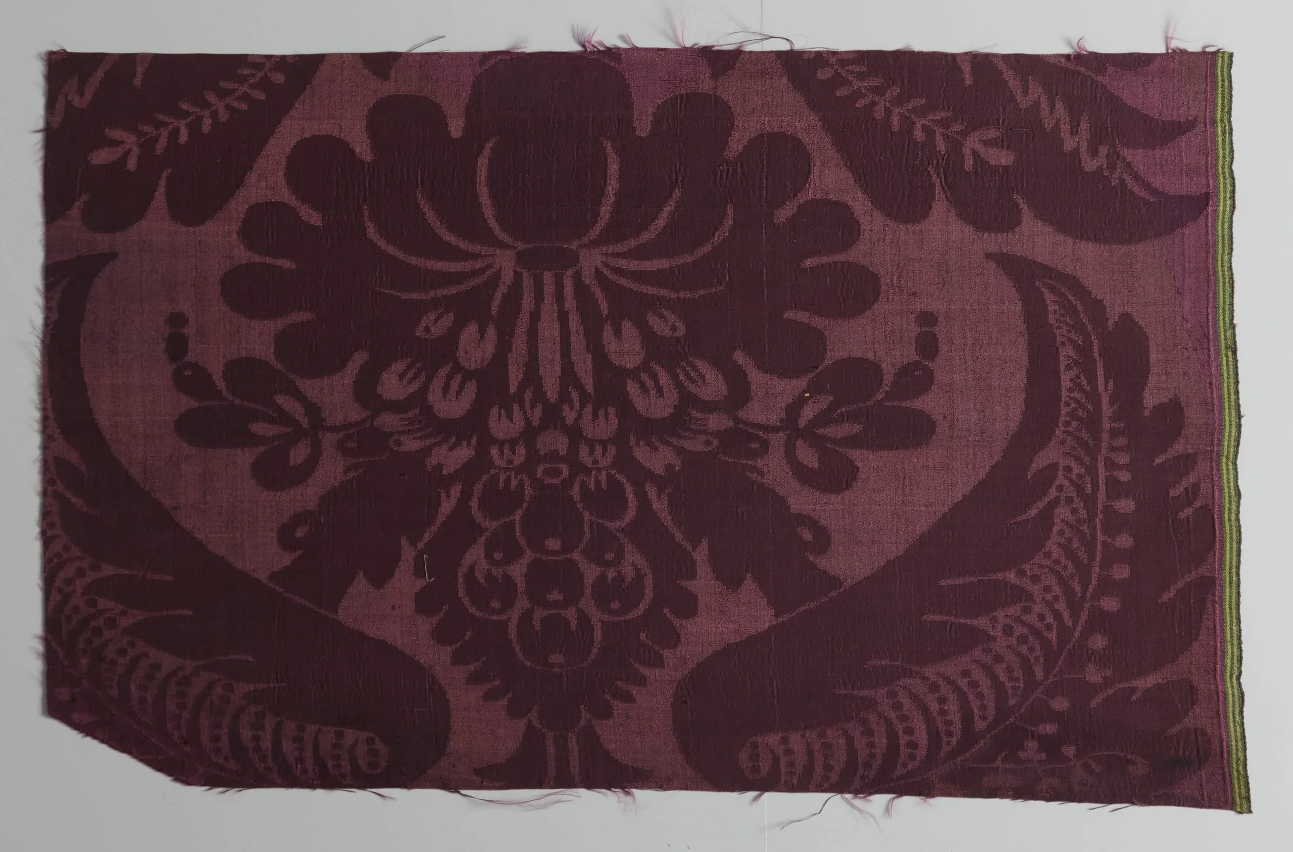 Horizontal textile fragment in two-toned burgundy-red with a large-scale woven damask pattern of a central flower, cascading grapes, and symmetrical acanthus fronds; narrow chartreuse selvedge stripe along the right edge