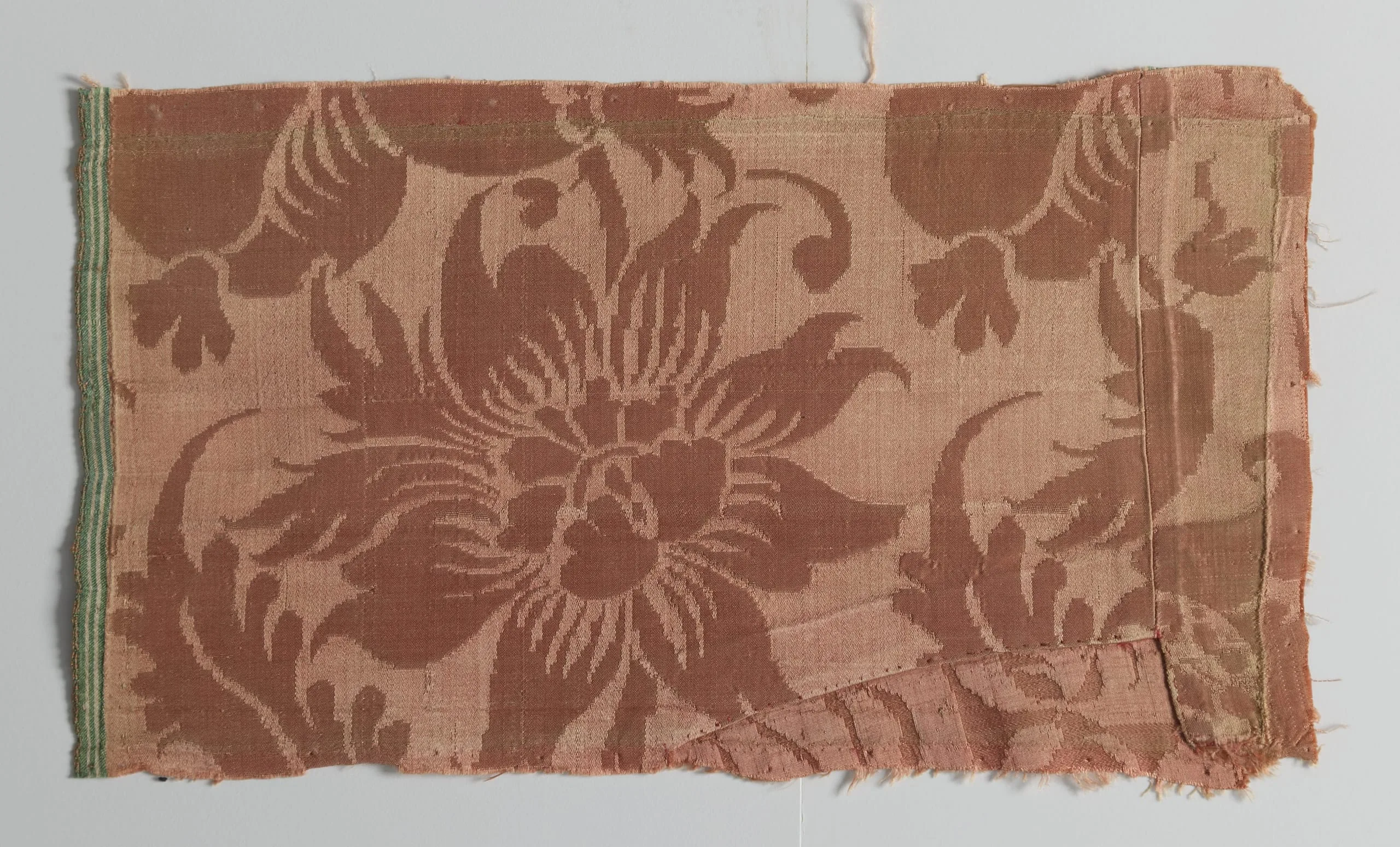 Textile fragment with two-tone rose damask weave, large central passion flower and scrolling foliage, narrow sage green selvedge along left edge