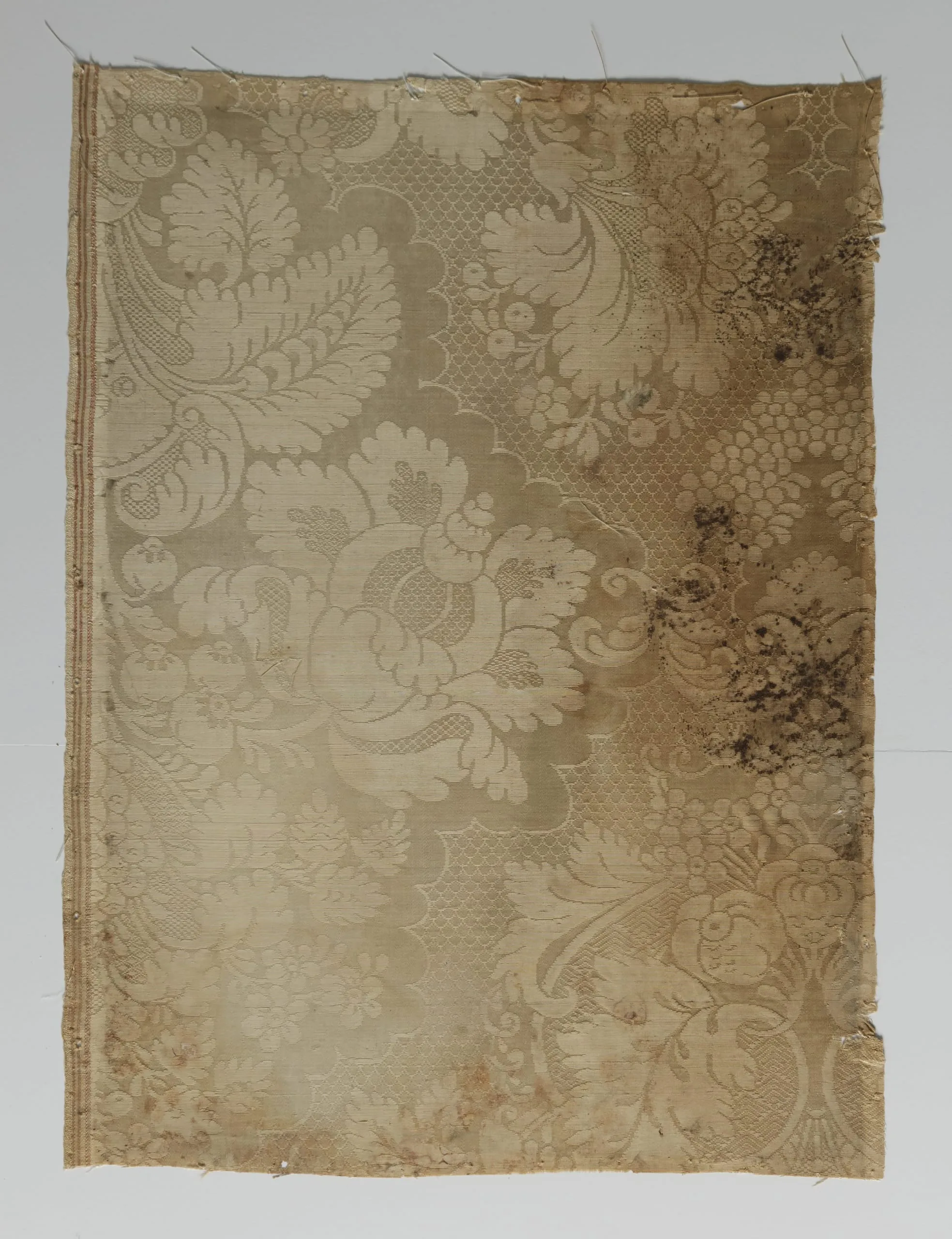Vertical silk damask or brocade textile fragment in parchment tan and ivory, with large-scale floral and acanthus leaf pattern; right side shows heavy staining and discoloration