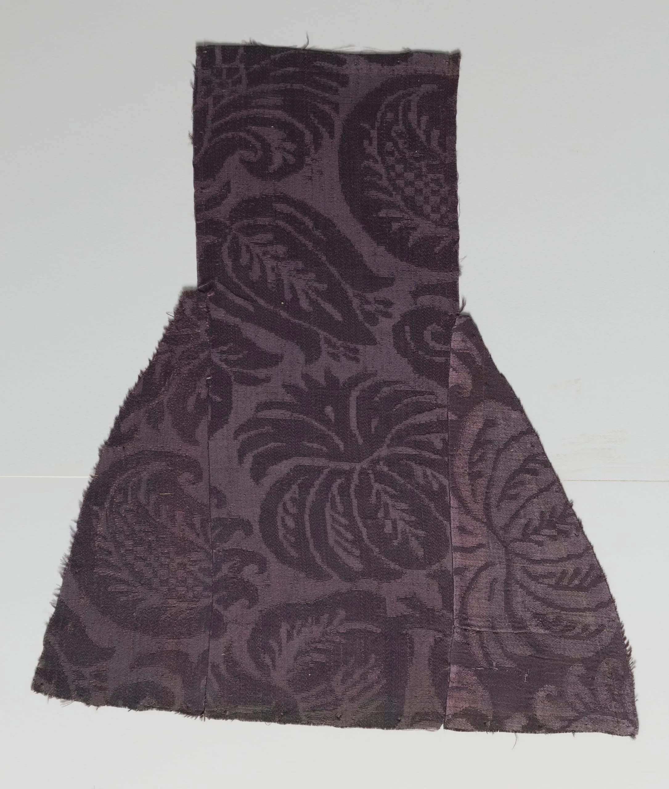 Damask textile fragment in dusty mauve and deep eggplant purple, T-shaped construction from three panels, with an allover woven pattern of large medallions, pineapple motifs, and curling acanthus fronds