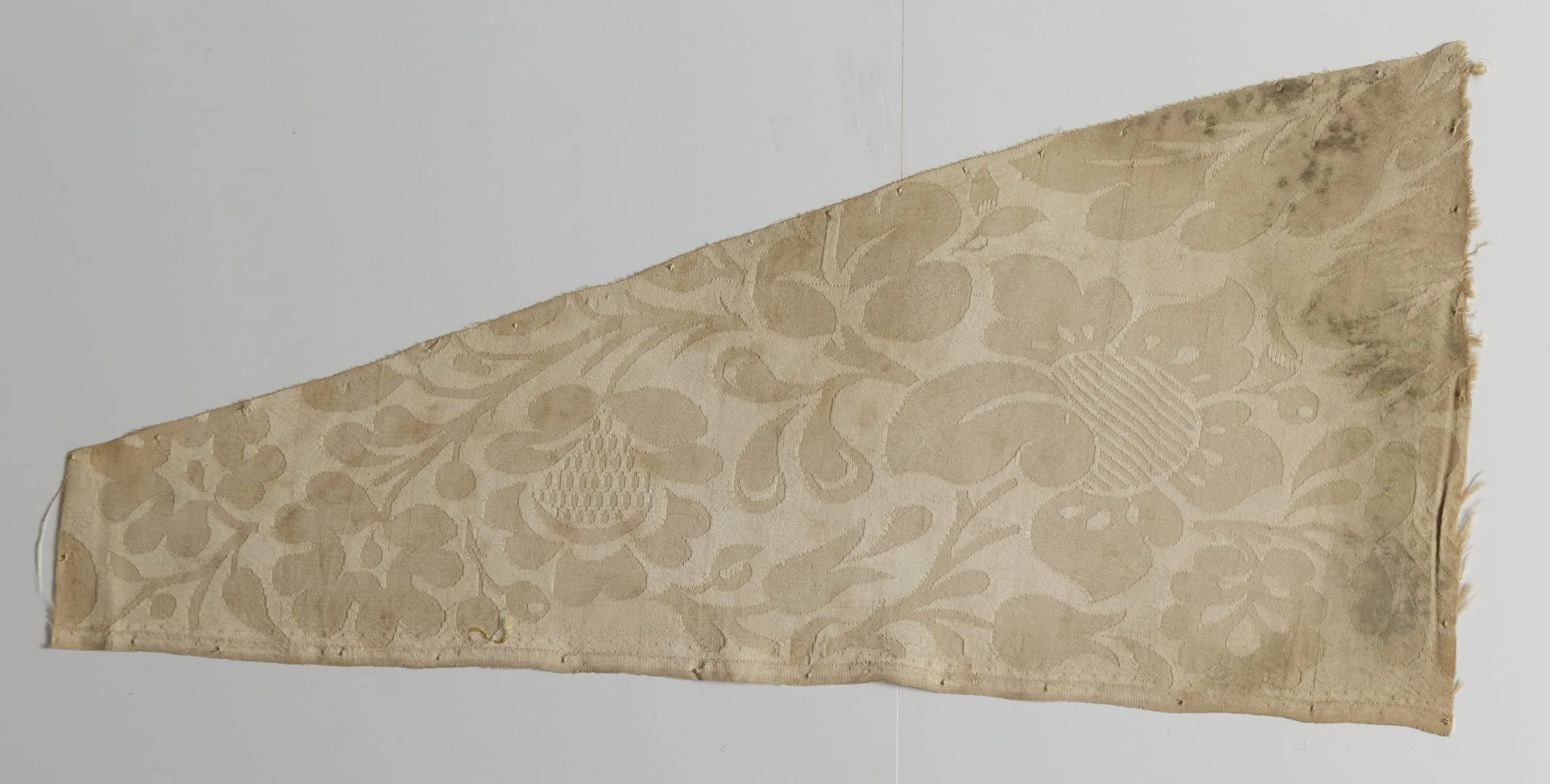 Cream-colored wedge-shaped textile fragment with a damask or brocade weave pattern of large floral motifs, scrolling leaves, and a ribbed vase or basket design