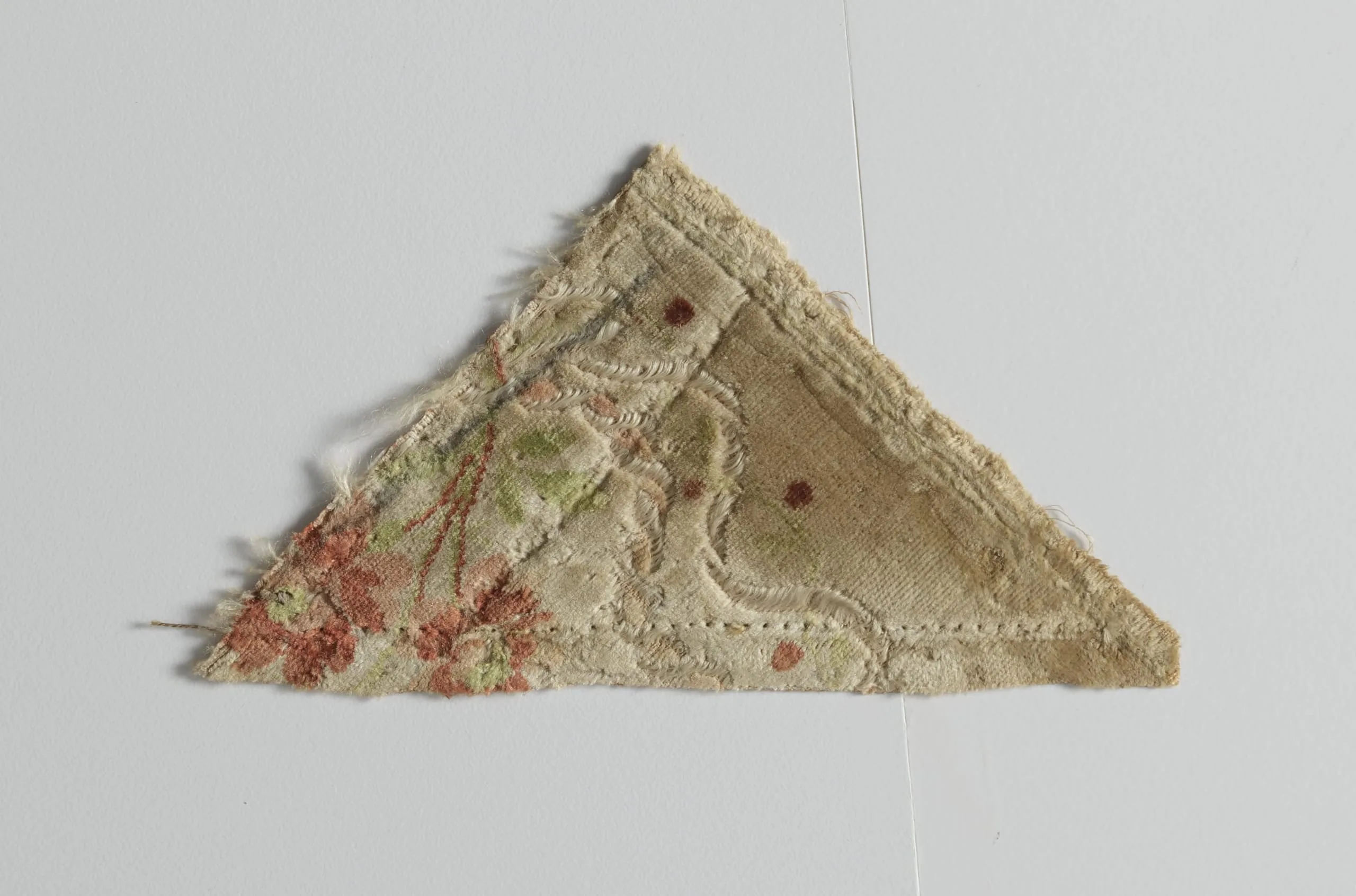 Small triangular textile fragment with faded pink and green floral pattern on the left, quilted cream fabric on the right, and visible hand-stitching along the edges