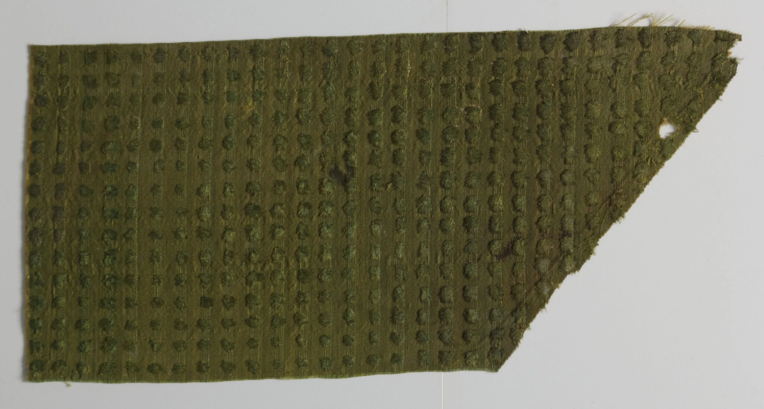 Textile fragment in olive green with an allover grid of small raised circular knots against a ribbed woven ground, with frayed unfinished edges