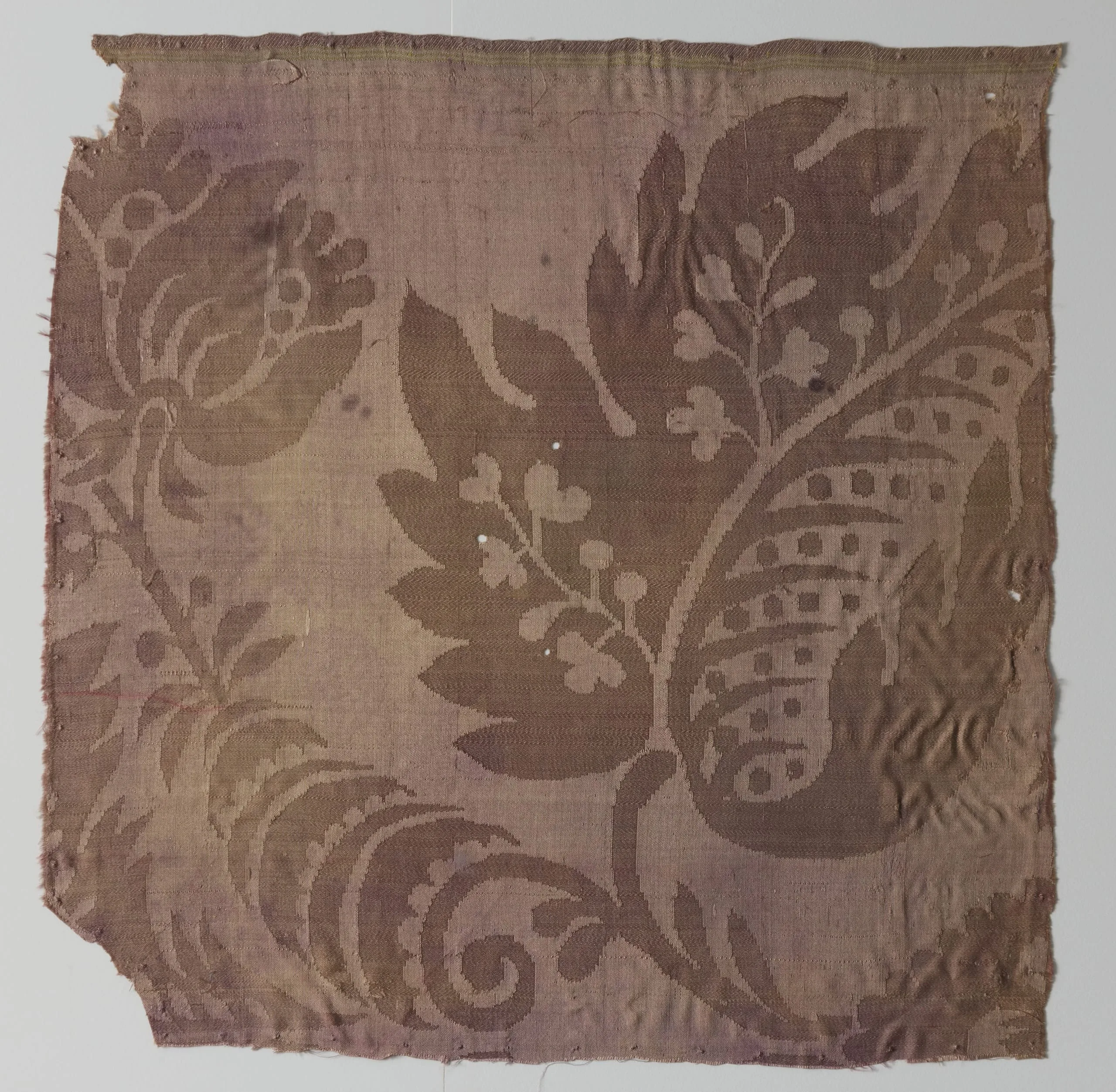 Woven textile fragment in dusty mauve and taupe, with a large-scale botanical damask pattern of broad leaves, berry clusters, feathery fronds, and a dotted oval motif, with frayed edges