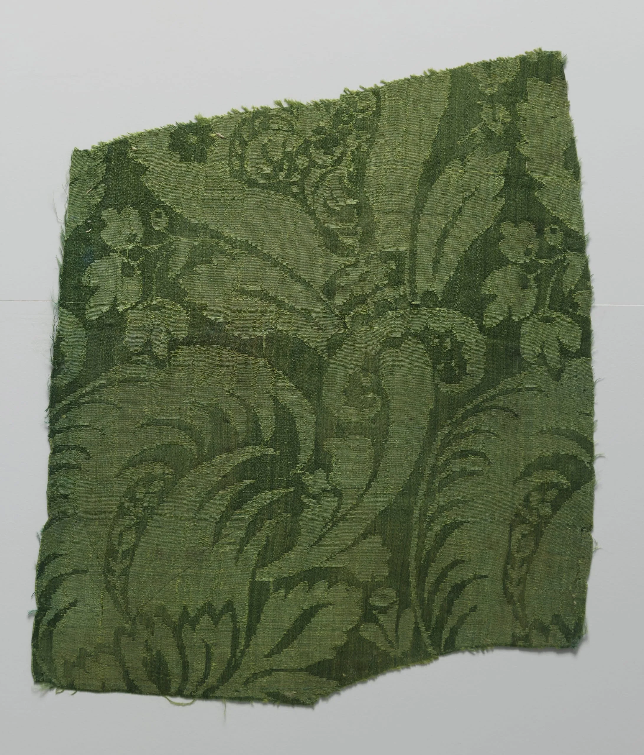 Textile fragment woven in sage and forest green damask with large acanthus scroll and floral motifs, raw frayed edges
