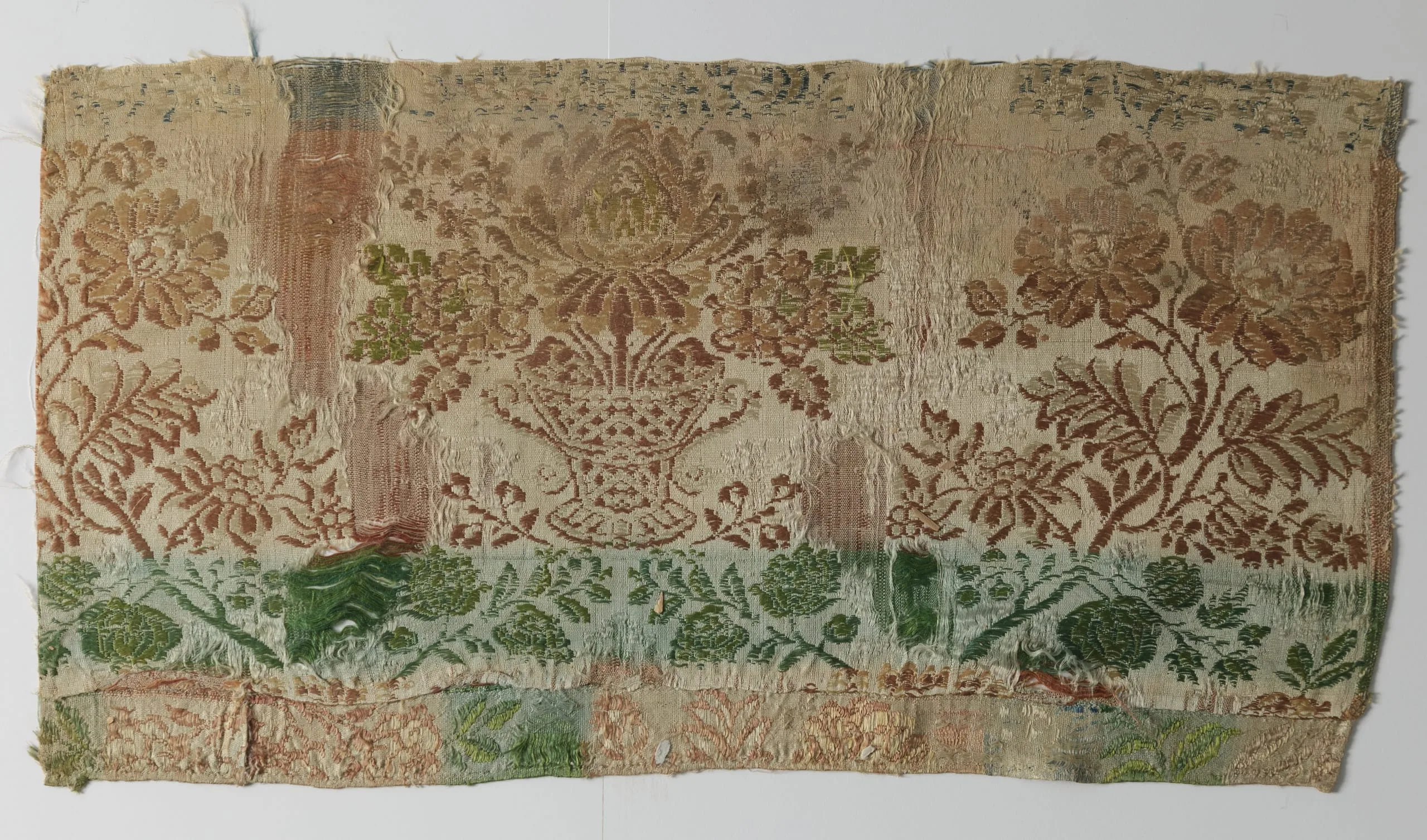 Rectangular silk brocade textile fragment with a cream ground, featuring repeating floral urn motifs in dusty rose and olive green, with a contrasting blue-gray botanical border along the lower edge