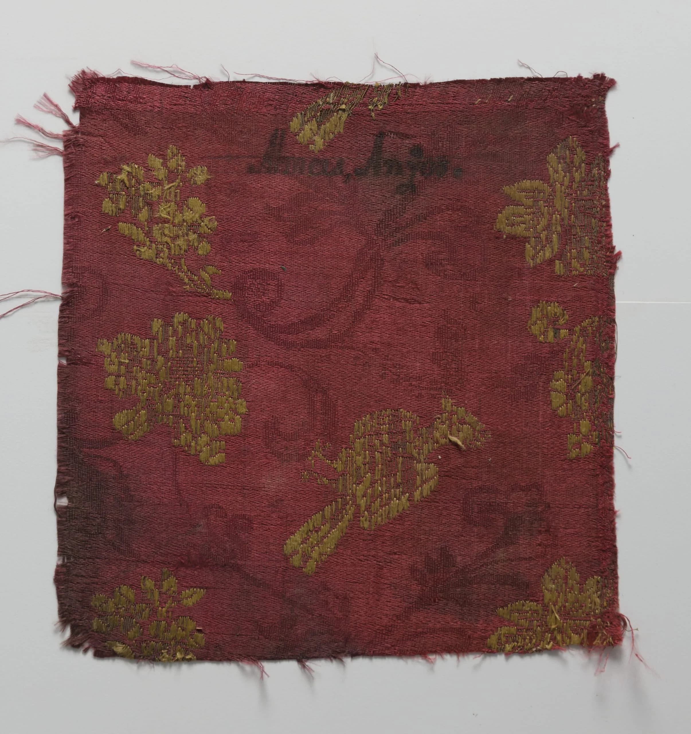 Square silk textile fragment with deep crimson ground and scattered olive-gold woven floral motifs, with frayed edges and a handwritten ink inscription near the top center
