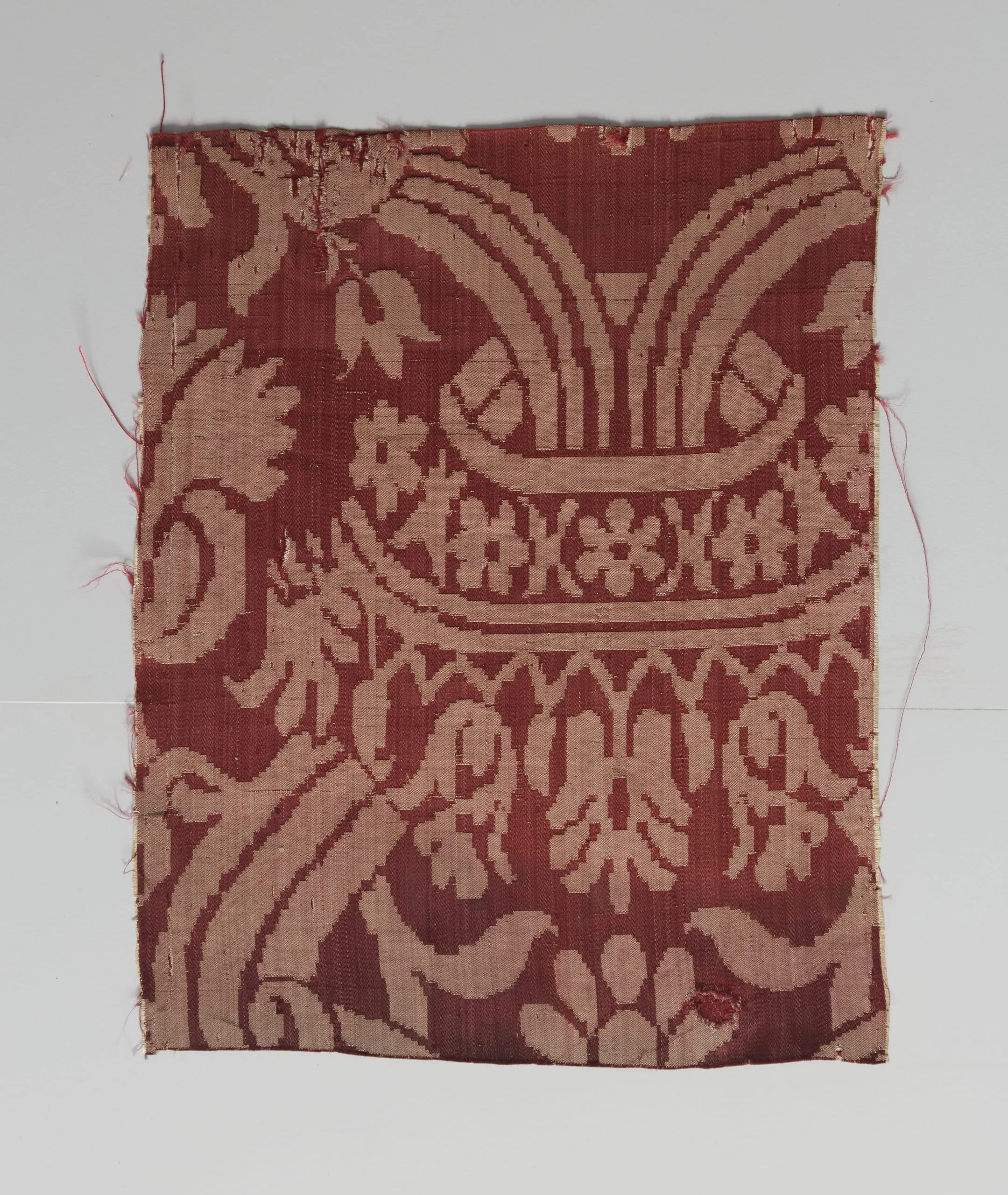 Woven textile fragment in deep burgundy red and dusty rose pink, with a large-scale repeating pattern of architectural canopy forms, scrolling acanthus leaves, and stylized floral motifs