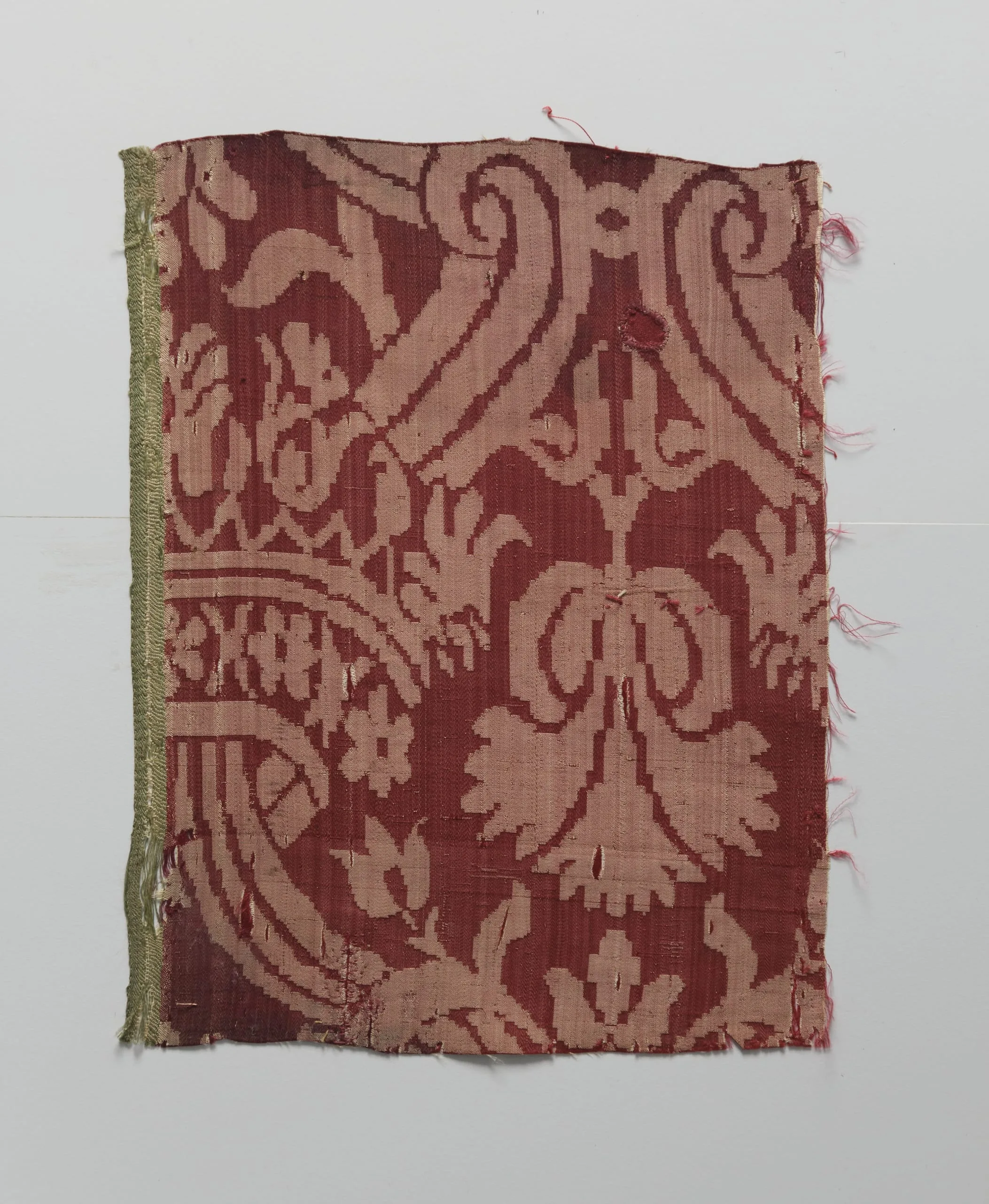 Textile fragment with deep burgundy ground and salmon-pink woven pattern of large scrolling acanthus leaves and symmetrical floral motifs, with frayed edges and a narrow olive-green border along the left side