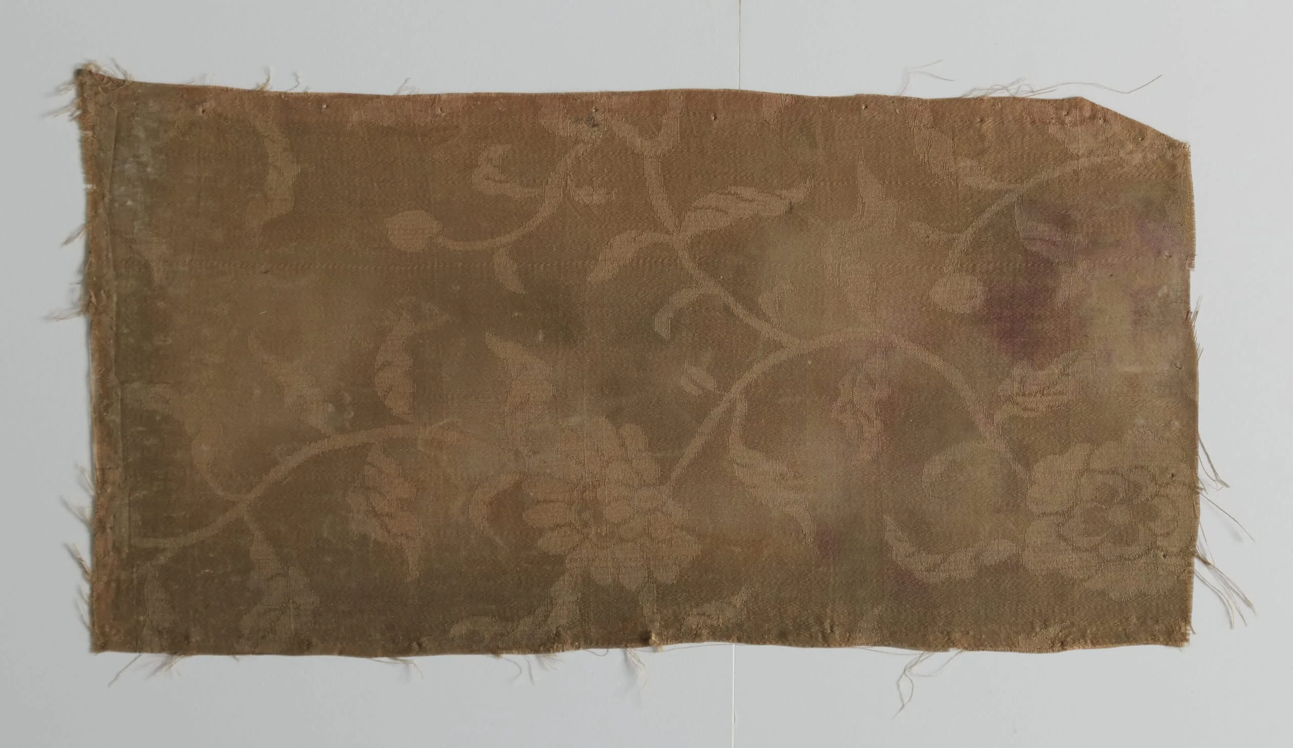 Horizontal fragment of tan damask textile with an allover pattern of large flowering vines and scrolling stems, frayed on all edges with faint staining in one corner