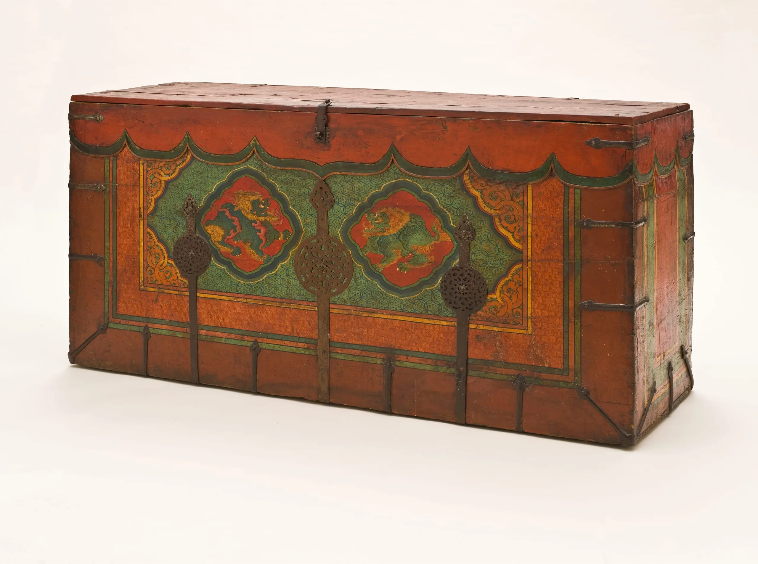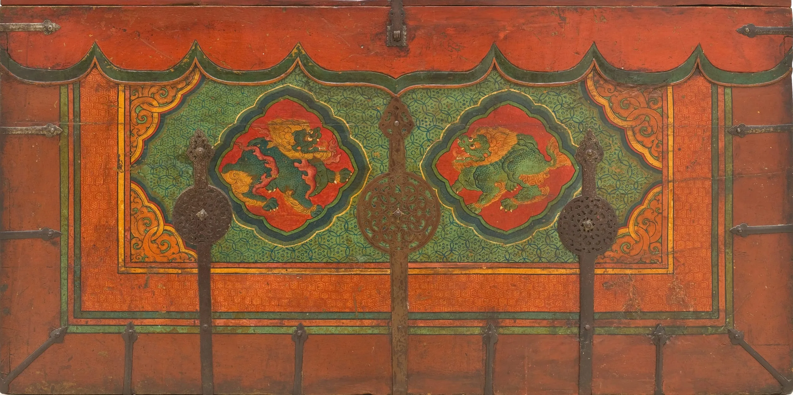 This exceptionally large and high quality painted trunk is adorned with confronting snow lions (Tibetan: gangs seng ge). An ancient legendary creature of Tibet, the snow lion was a powerful guardian symbol of the Imperial Tibetan Empire (618–842) prior to the introduction of Buddhism in Tibet in the 7th century. It is a national emblem of Tibet and in Buddhist belief symbolizes fearless joy and spiritual purity and transformation. See also AC1992.75.1 and M.2006.62.1.
