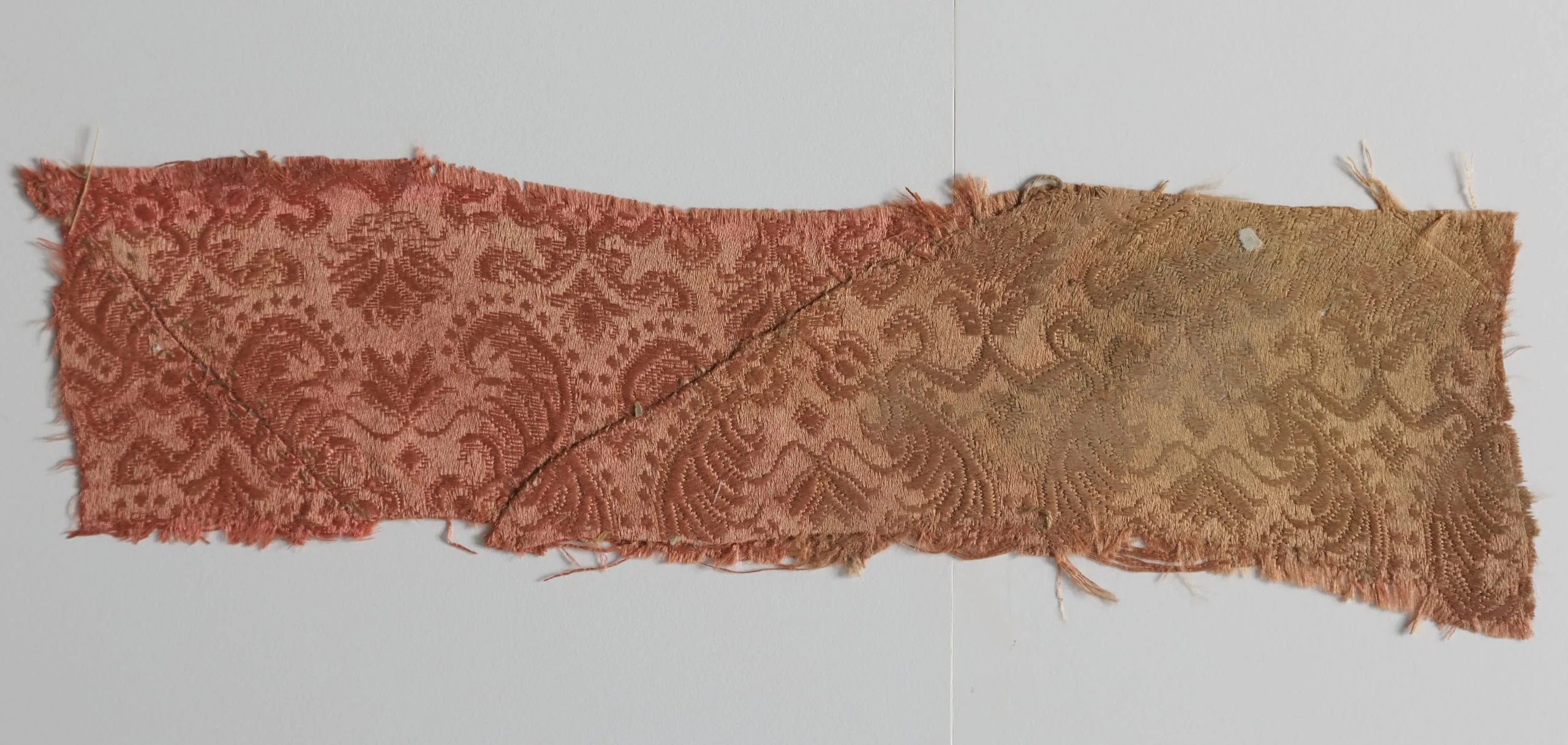 Textile fragment in salmon-pink damask or brocade weave with an all-over floral and foliate repeat pattern, faded to tan on the right third, with fraying edges
