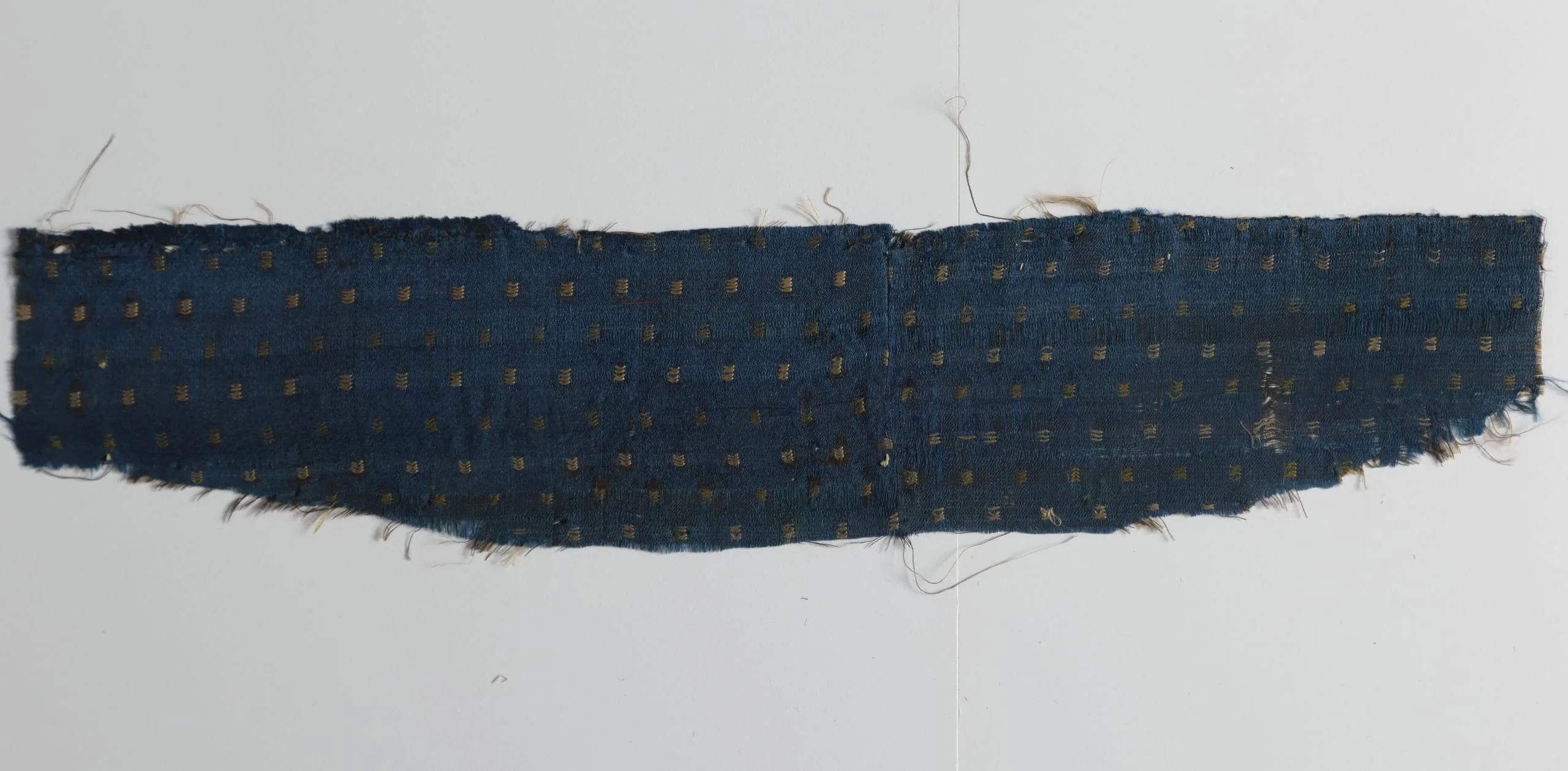 Textile fragment, long narrow strip of deep indigo blue woven fabric with an allover grid pattern of small gold square motifs and frayed edges on all sides
