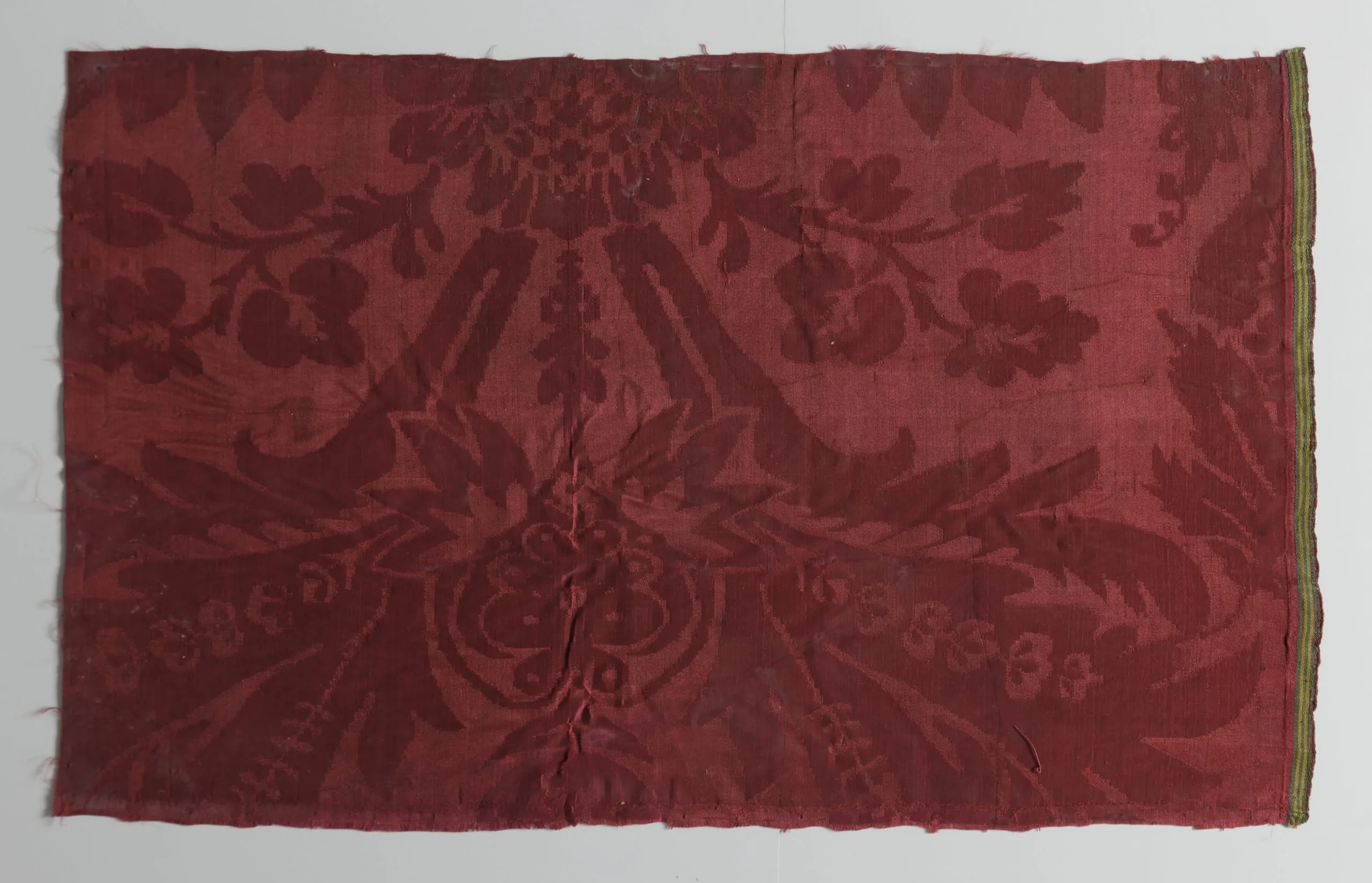 Horizontal silk damask fragment with a self-patterned crimson and burgundy symmetrical floral and foliage design; narrow olive and yellow-green selvedge stripe visible along the right edge