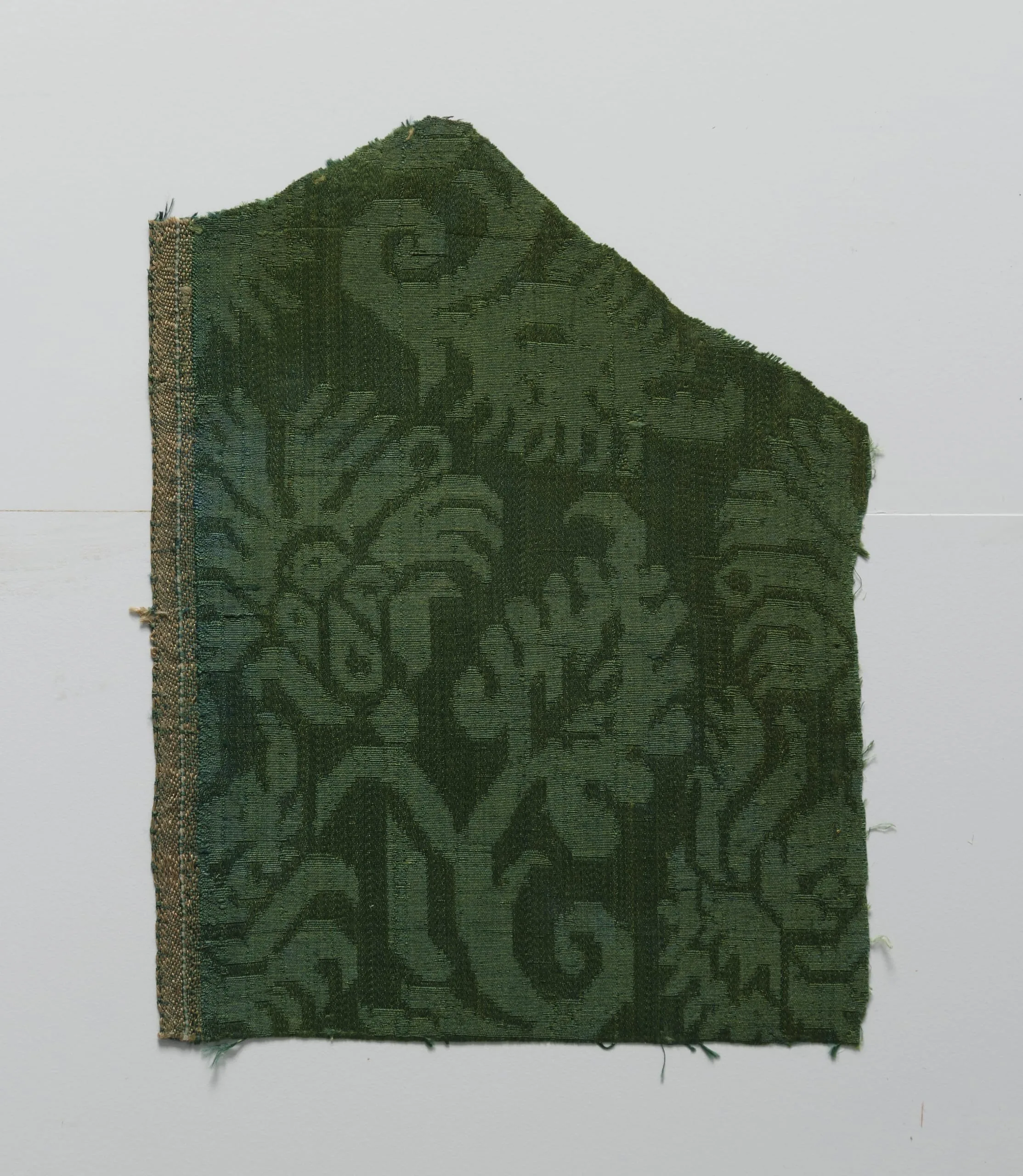 Textile fragment woven in two shades of deep forest green with a large-scale symmetrical pattern of stylized leaves, tendrils, and scrolling volutes; frayed edges and partial selvedge visible at left