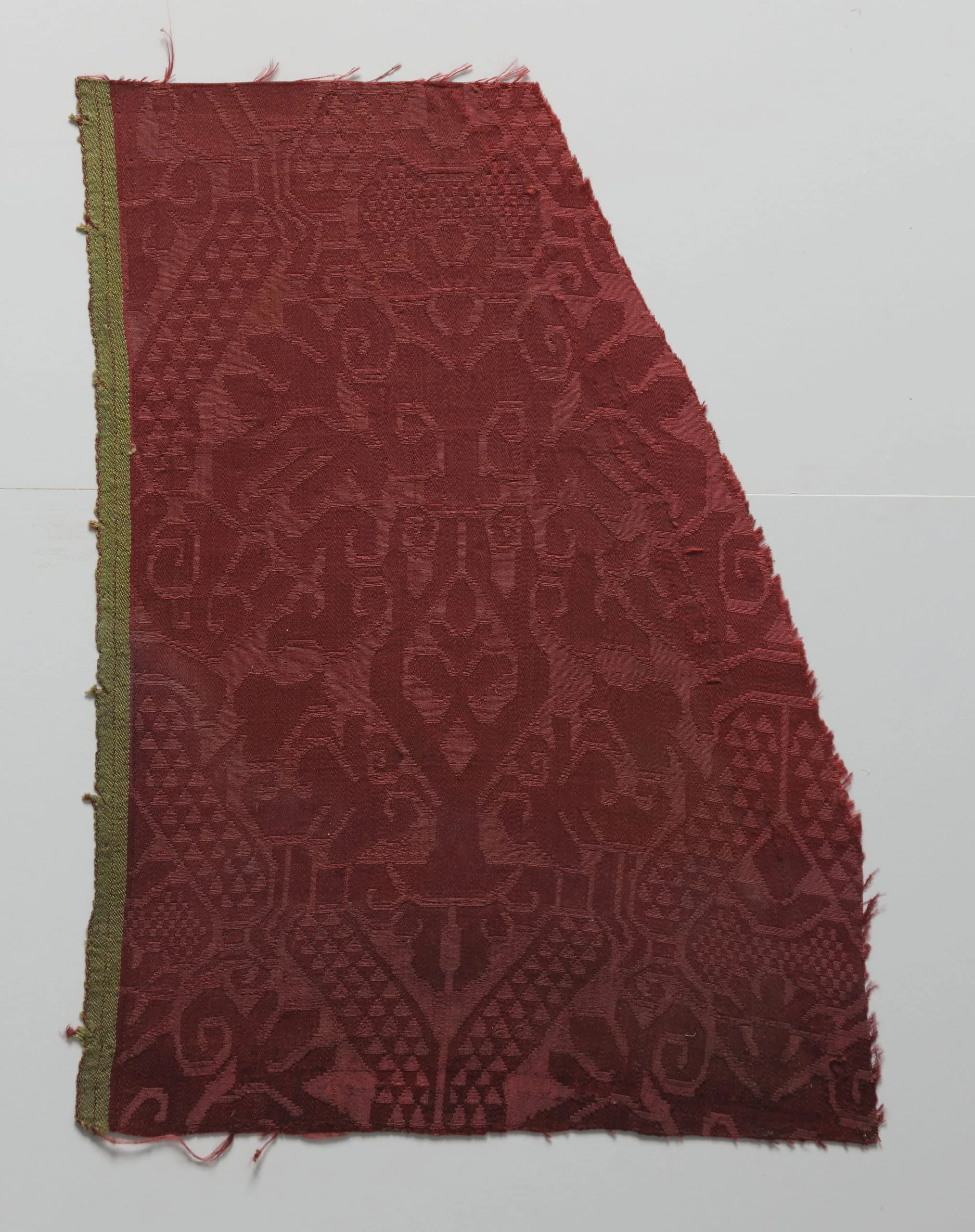 Crimson red damask textile fragment with allover symmetrical arabesque pattern of palmettes, vases, and scrolling vines woven in two tones of red, with a narrow olive green border along the left edge