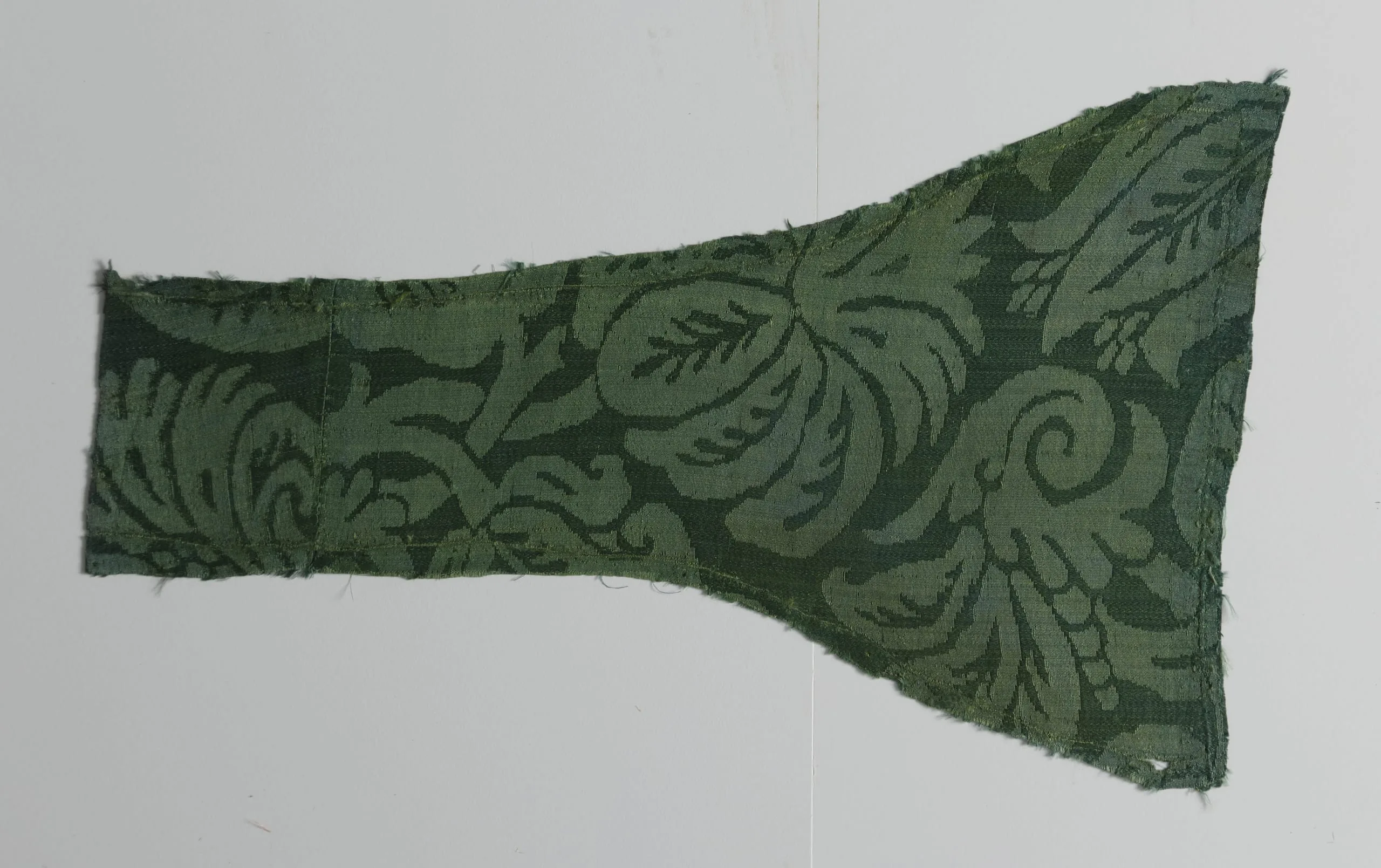 Wedge-shaped textile fragment woven in two-tone green damask with an allover pattern of curling acanthus leaves, scrolling stems, and branching sprigs