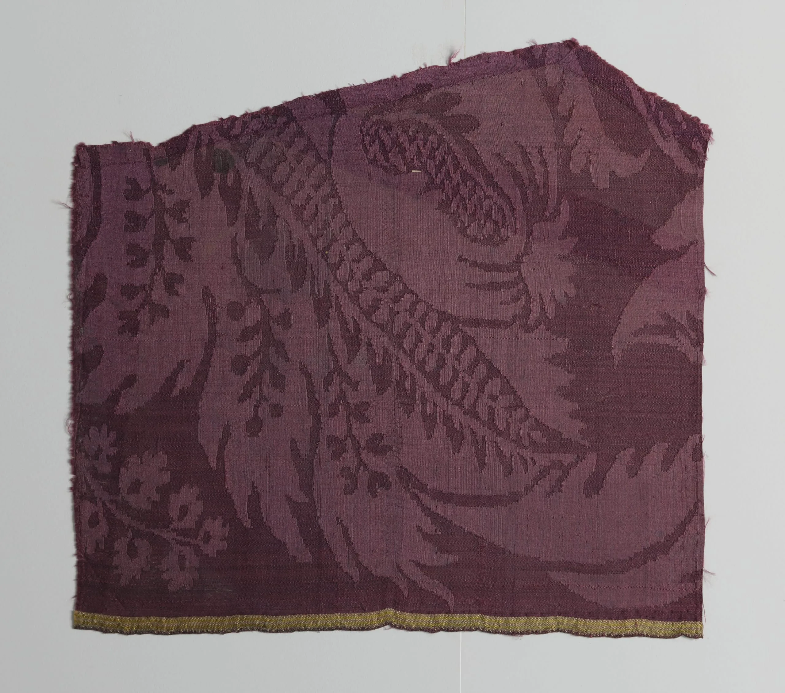 Textile fragment in two-tone plum damask weave, with a large-scale pattern of scaled dragon-like creatures, feathery fronds, and small floral sprigs, with a narrow olive and gold trim along the bottom edge