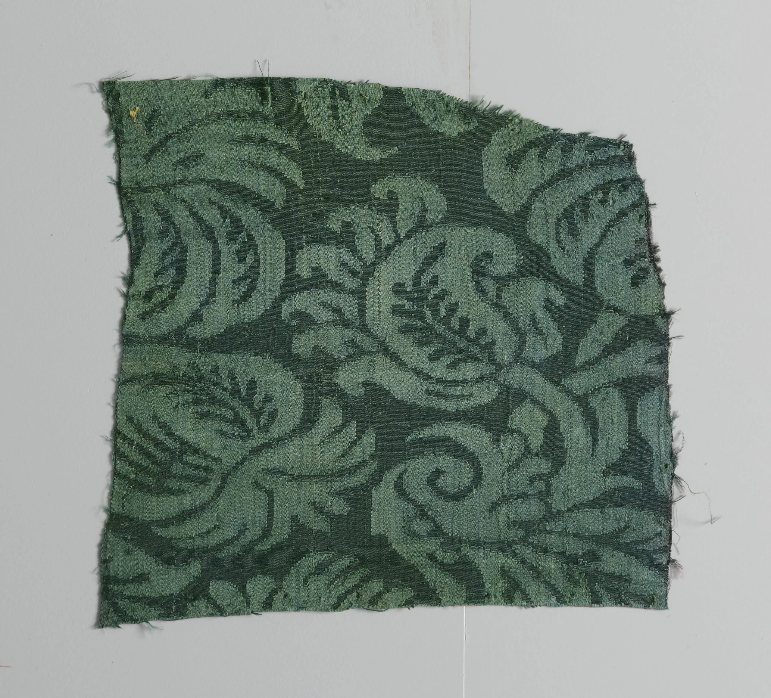 Square textile fragment with frayed edges, woven in deep forest green and sage green in an allover pattern of large curling acanthus leaves and scrolling stems