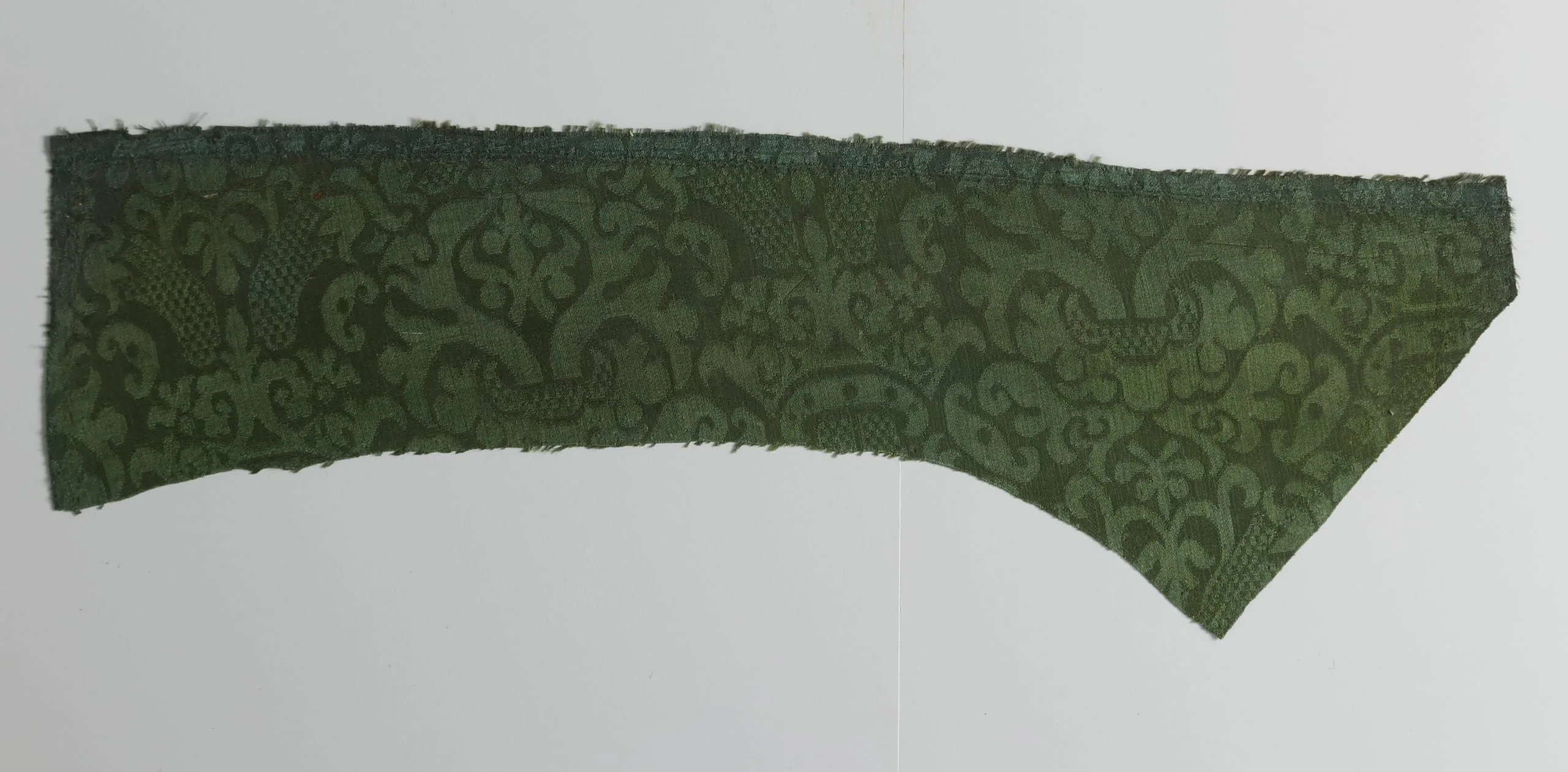 Textile fragment in two-toned forest green damask weave with allover scrolling vine, acanthus leaf, and stylized floral pattern; edges frayed