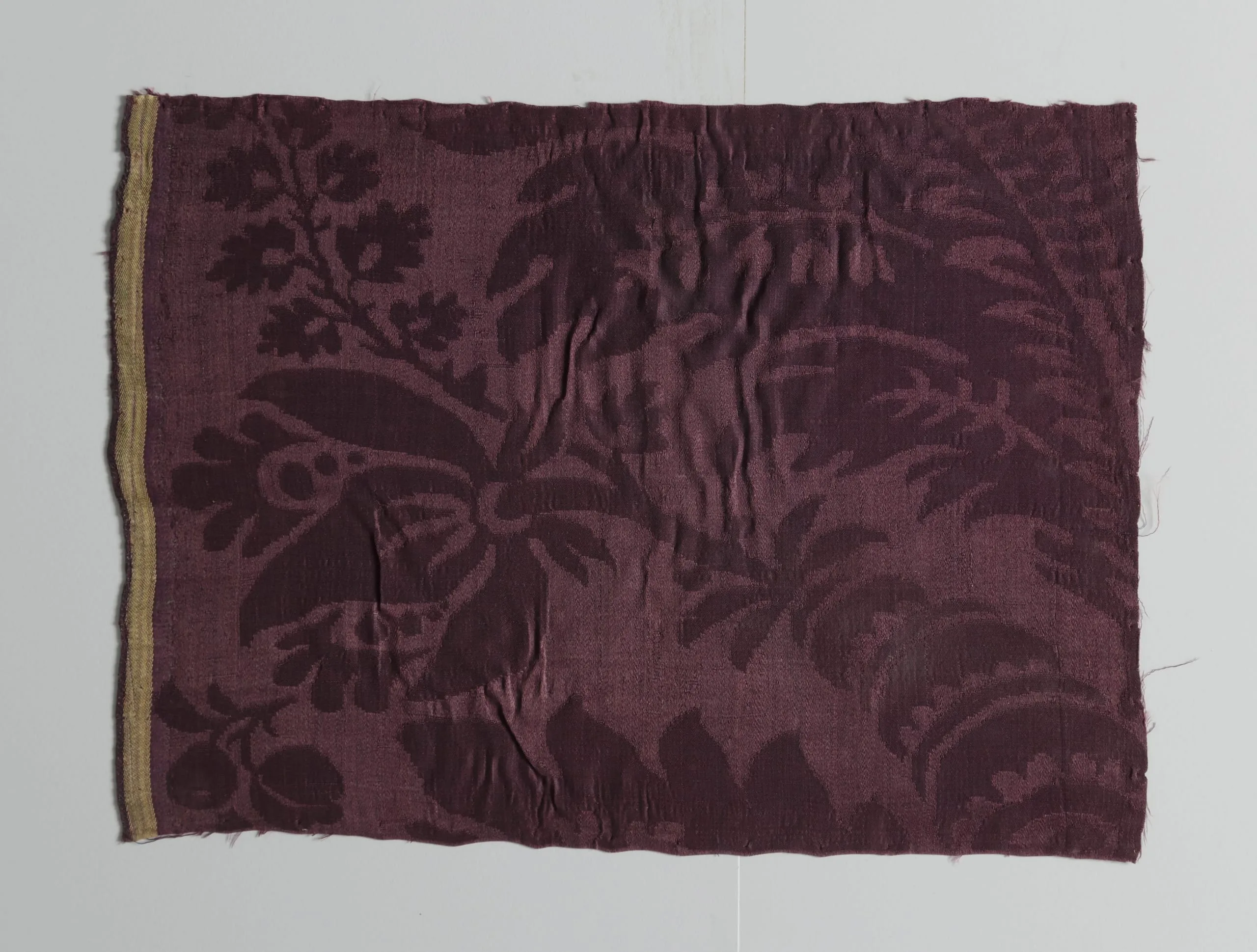 Horizontal damask textile fragment woven in two tones of burgundy-purple with a large-scale floral and foliage pattern; narrow olive gold selvage along the left edge