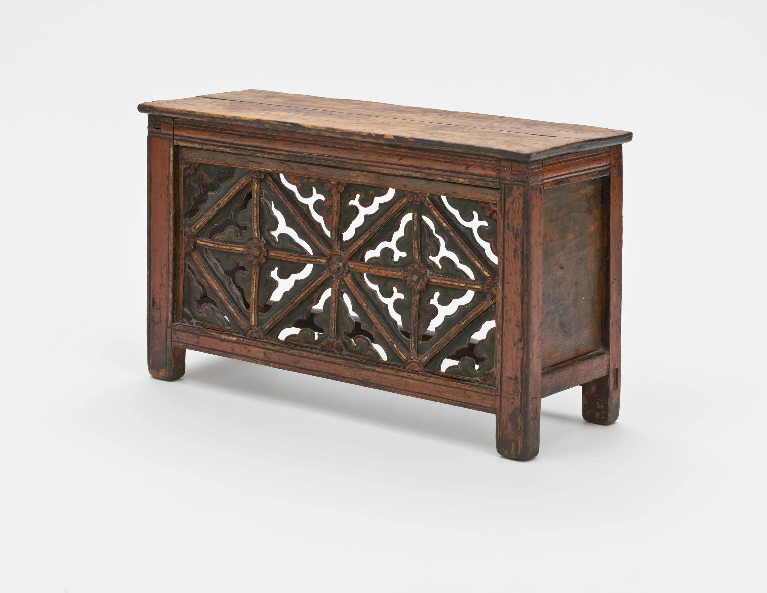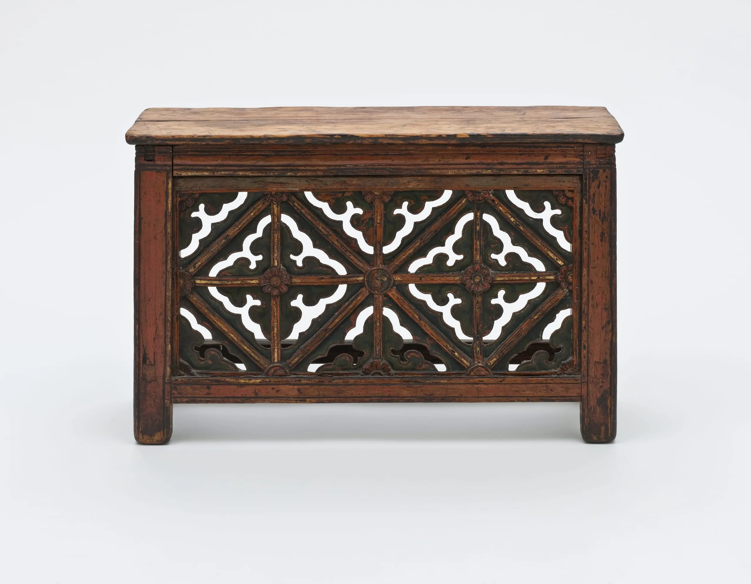 This table has an openwork front panel with an understated design of two large diamond-shaped frames with double thunderbolts (vishva vajras) in cloud forms and rosettes in the center. Half-double thunderbolts fill the interstices between the diamonds. The corner designs are cloud forms. In the center junction of the two diamond points is a medallion with a multicolored yin-yang or taijitu symbol. The topboard and sides are unadorned. The back is open with a single stretcher bar.