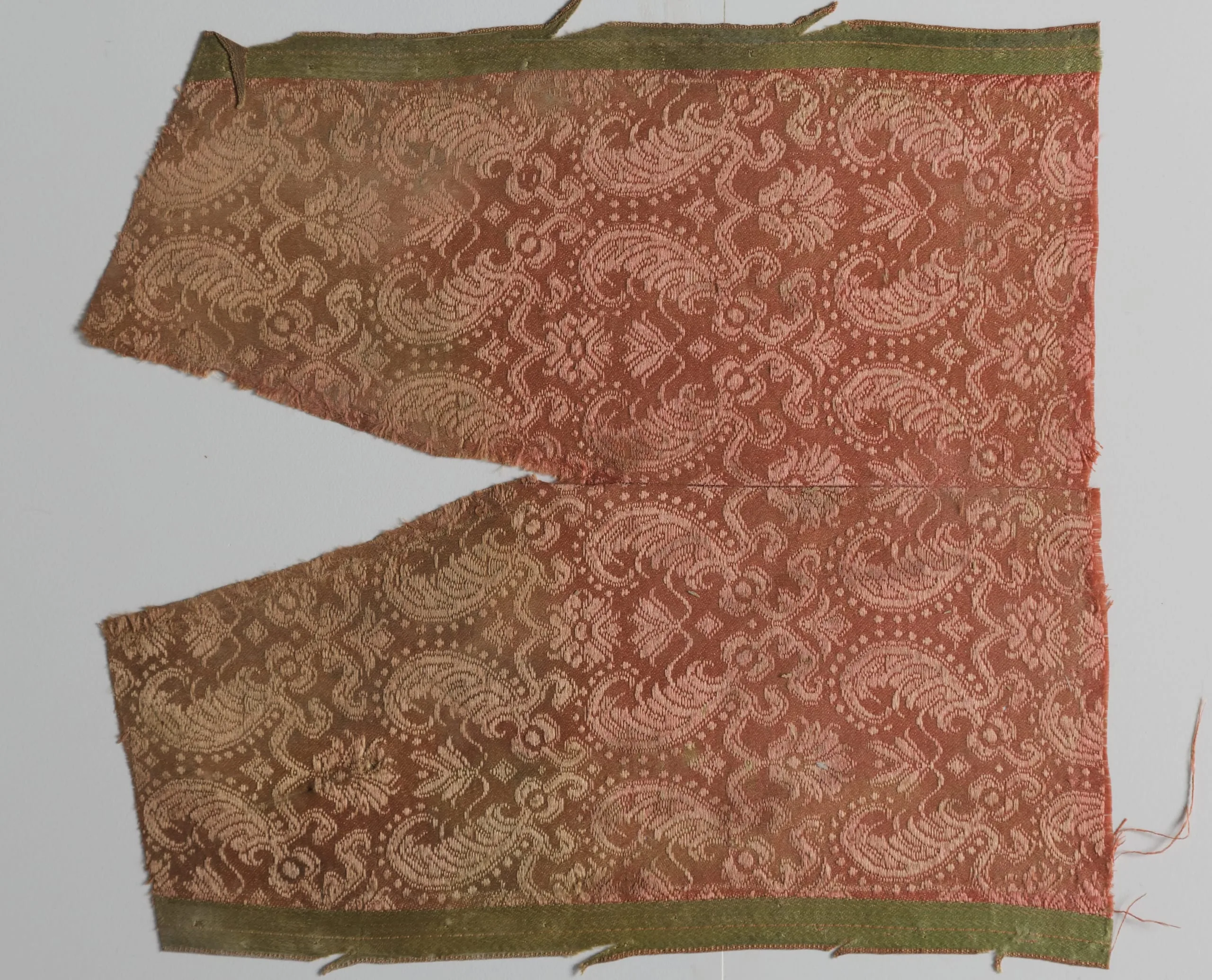 Two rust-red woven textile fragments with an allover cream paisley and scrolling leaf pattern, edged with olive green ribbon tape, laid flat