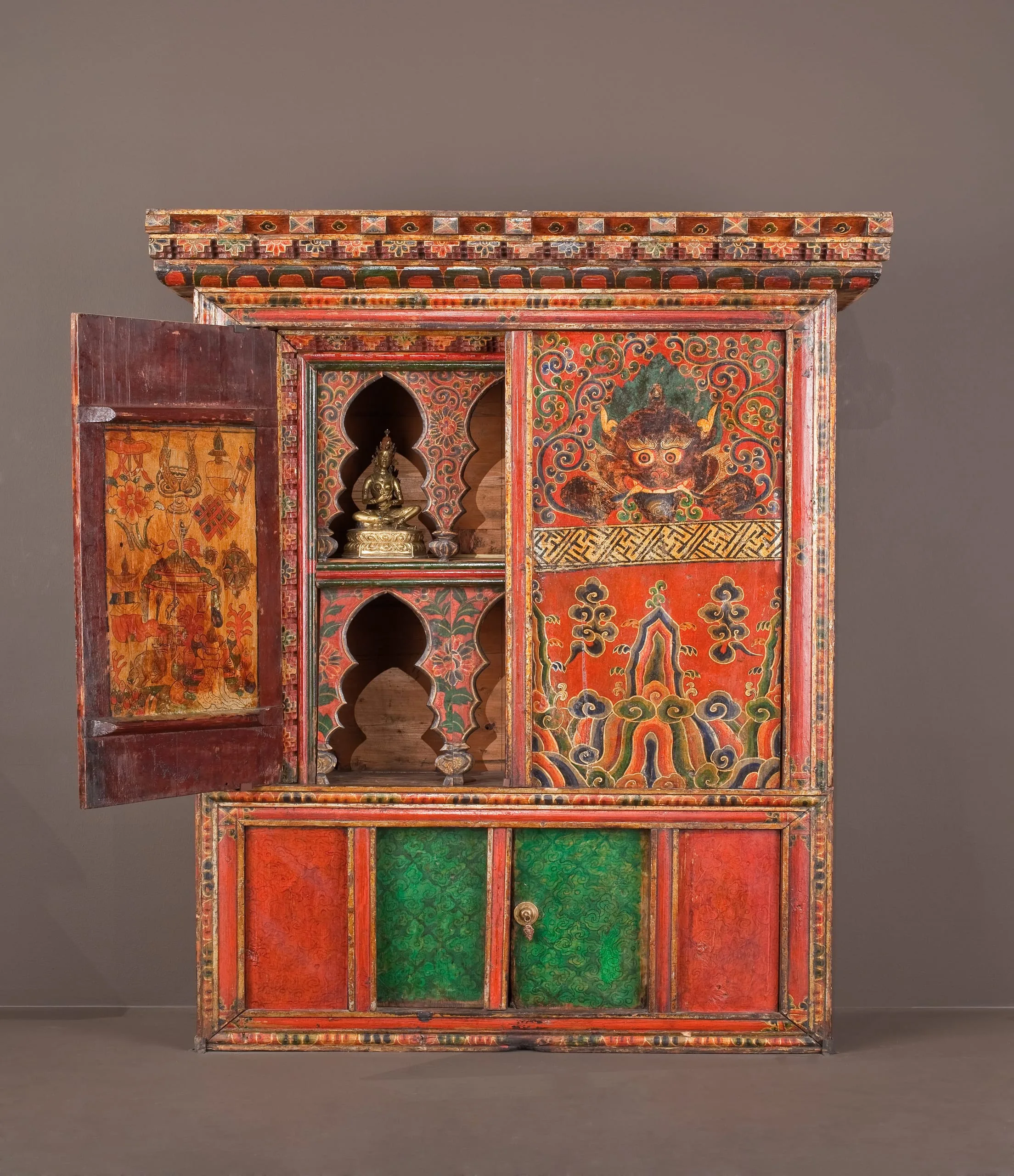 Tibetan cabinets, typically furnished with doors in the front, were used on temple altars to store religious icons. They were also found in the private chapels of wealthy households. From the late 18th century onward, decorative cabinets were also used to store mundane items in monasteries secular houses.