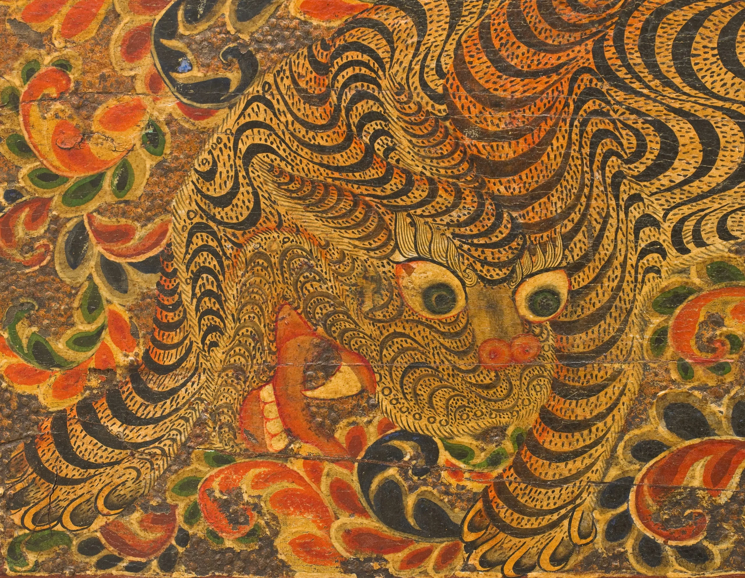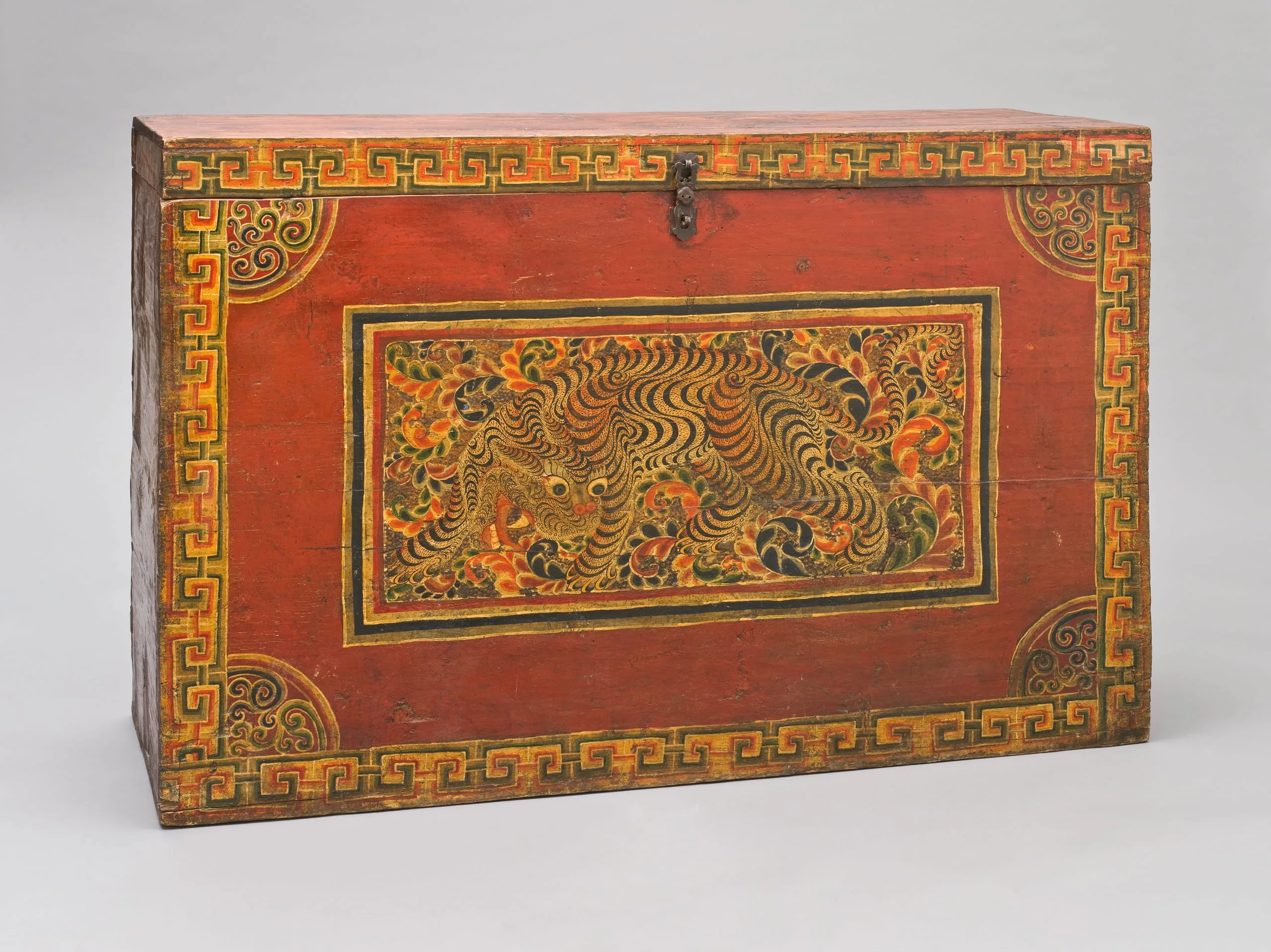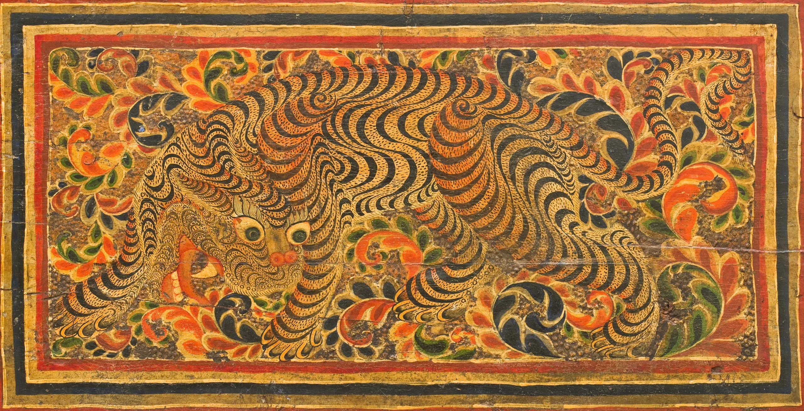 The elaborate imagery used to embellish Tibetan furniture not only parallels that of Tibetan painted religious scrolls (thangkas) and manuscripts, iconic sculpture, and ritual objects, but also presents an expanded repertoire of themes and stylistic treatments that are crucial for understanding the totality and range of dramatic expression in Tibetan art. Tigers, as well as dragons, snow lions, and mythical creatures, are often represented in the formal religious painting and sculpture used in the Tibetan Buddhist canonical tradition. In those tradition-bound works, however, animals and the auspicious symbols are typically shown as small subsidiary elements of a larger composition. In contrast, the Tibetan furniture designers were much freer to express their creativity than they were when making canonical sculpture and painting. Accordingly, they would often enlarge and enliven the animals or symbols as the primary subject of the decoration. Thus, the powerful imagery and elegant sense of design used to decorate Tibetan furniture is not only indicative of its superb aesthetic merit, but it also has strong art historical significance.