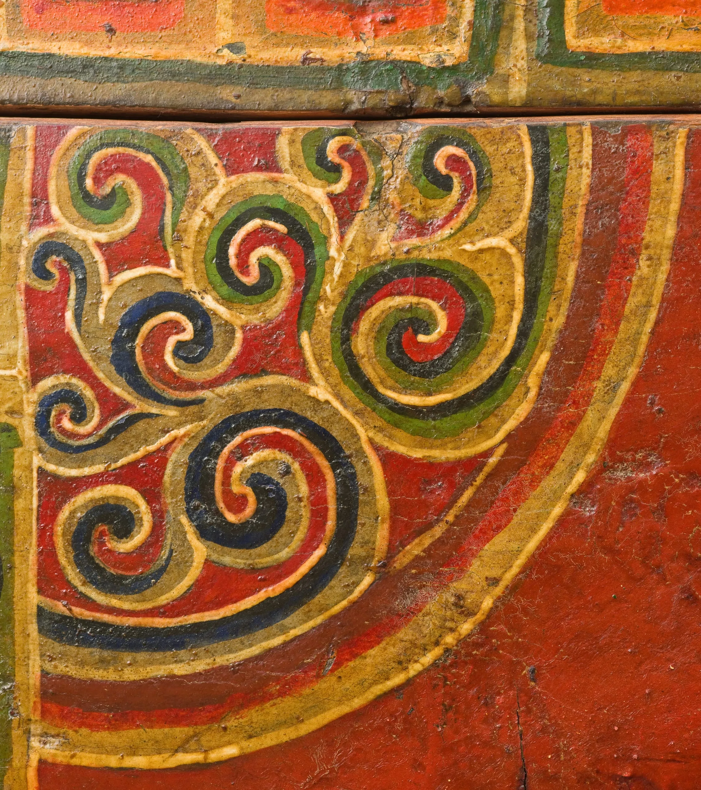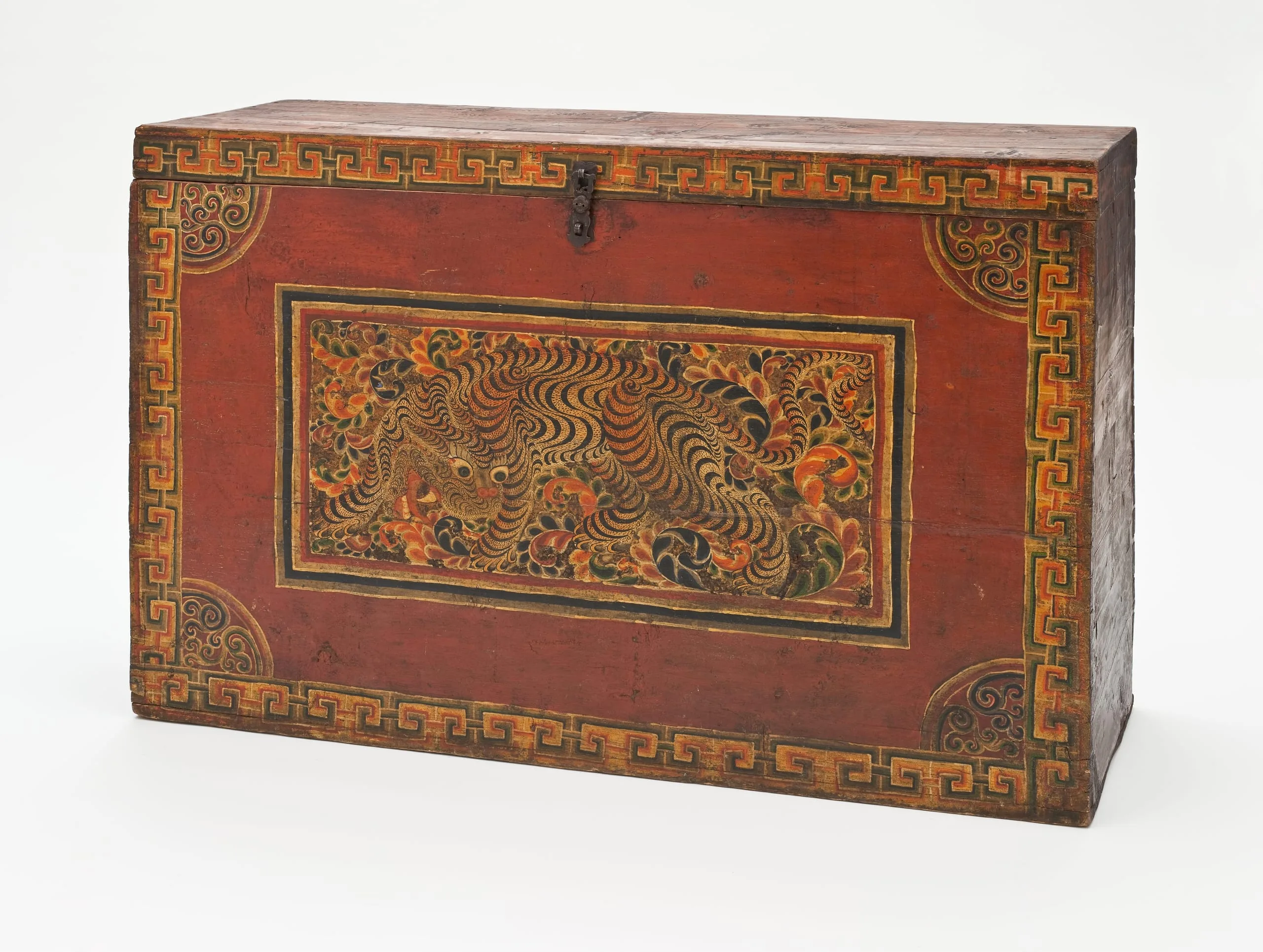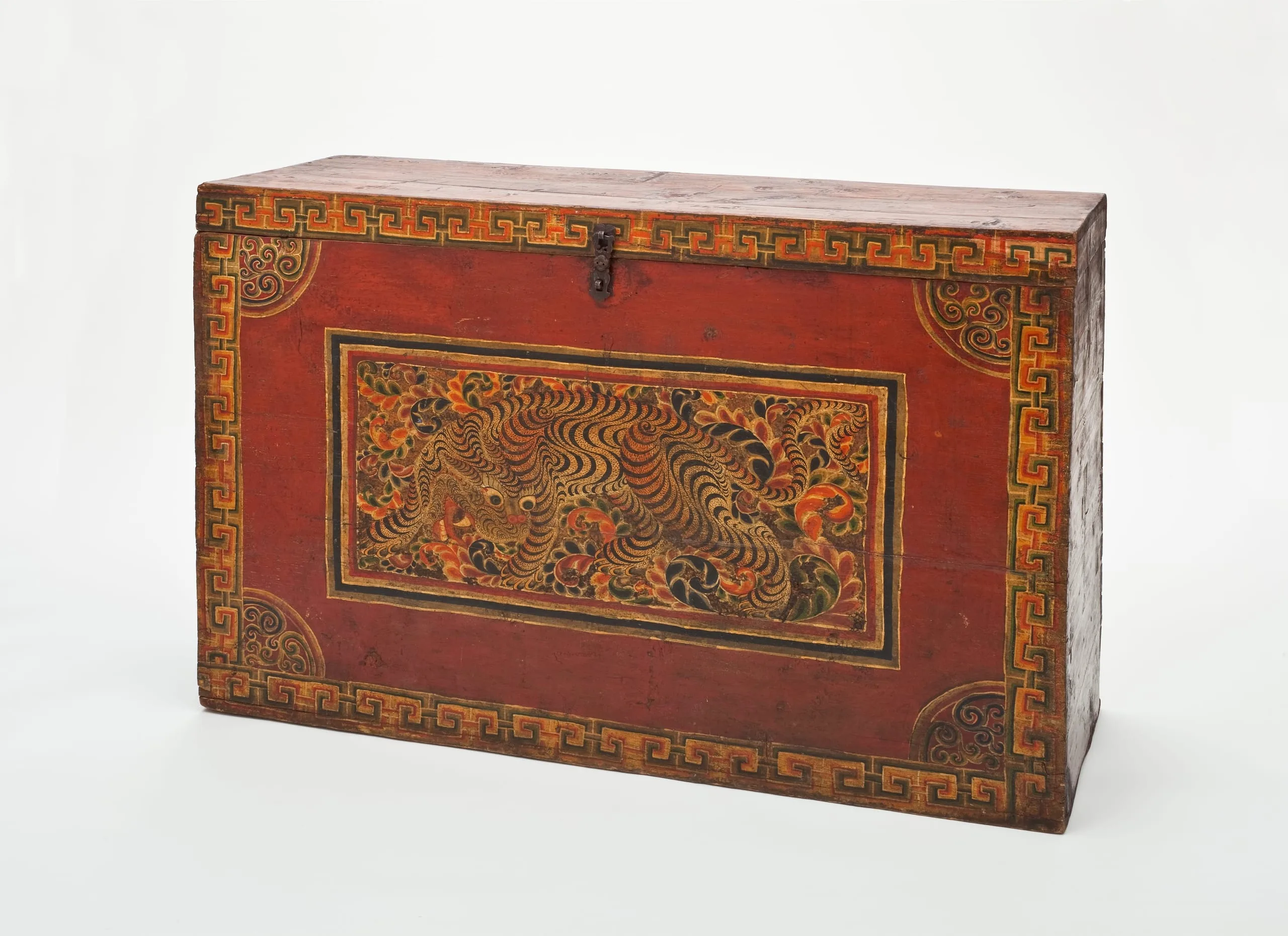 The elaborate imagery used to embellish Tibetan furniture not only parallels that of Tibetan painted religious scrolls (thangkas) and manuscripts, iconic sculpture, and ritual objects, but also presents an expanded repertoire of themes and stylistic treatments that are crucial for understanding the totality and range of dramatic expression in Tibetan art. Tigers, as well as dragons, snow lions, and mythical creatures, are often represented in the formal religious painting and sculpture used in the Tibetan Buddhist canonical tradition. In those tradition-bound works, however, animals and the auspicious symbols are typically shown as small subsidiary elements of a larger composition. In contrast, the Tibetan furniture designers were much freer to express their creativity than they were when making canonical sculpture and painting. Accordingly, they would often enlarge and enliven the animals or symbols as the primary subject of the decoration. Thus, the powerful imagery and elegant sense of design used to decorate Tibetan furniture is not only indicative of its superb aesthetic merit, but it also has strong art historical significance.