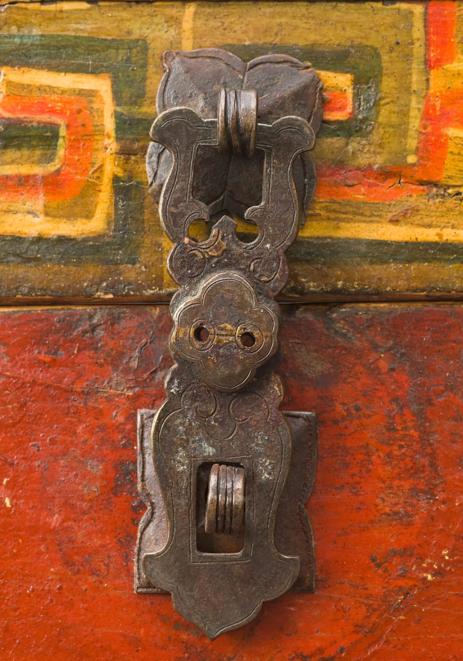 This can readily be demonstrated by this large painted Trunk with Tiger, which is attributed to the Kham region of eastern Tibet in the 19th or early 20th century. Surrounded by an outer border of stylized Greek key motifs with foliate corner designs, the center panel depicts a snarling tiger, alert and poised, in a field of vibrant flowers. The tiger’s bold stripes form a rhythmic pattern that enlivens him with a dynamic vitality and sense of movement, perfectly suited to express his wild nature and widely believed mystical power. This powerful tiger is indisputably one of the great animals in Asian art!