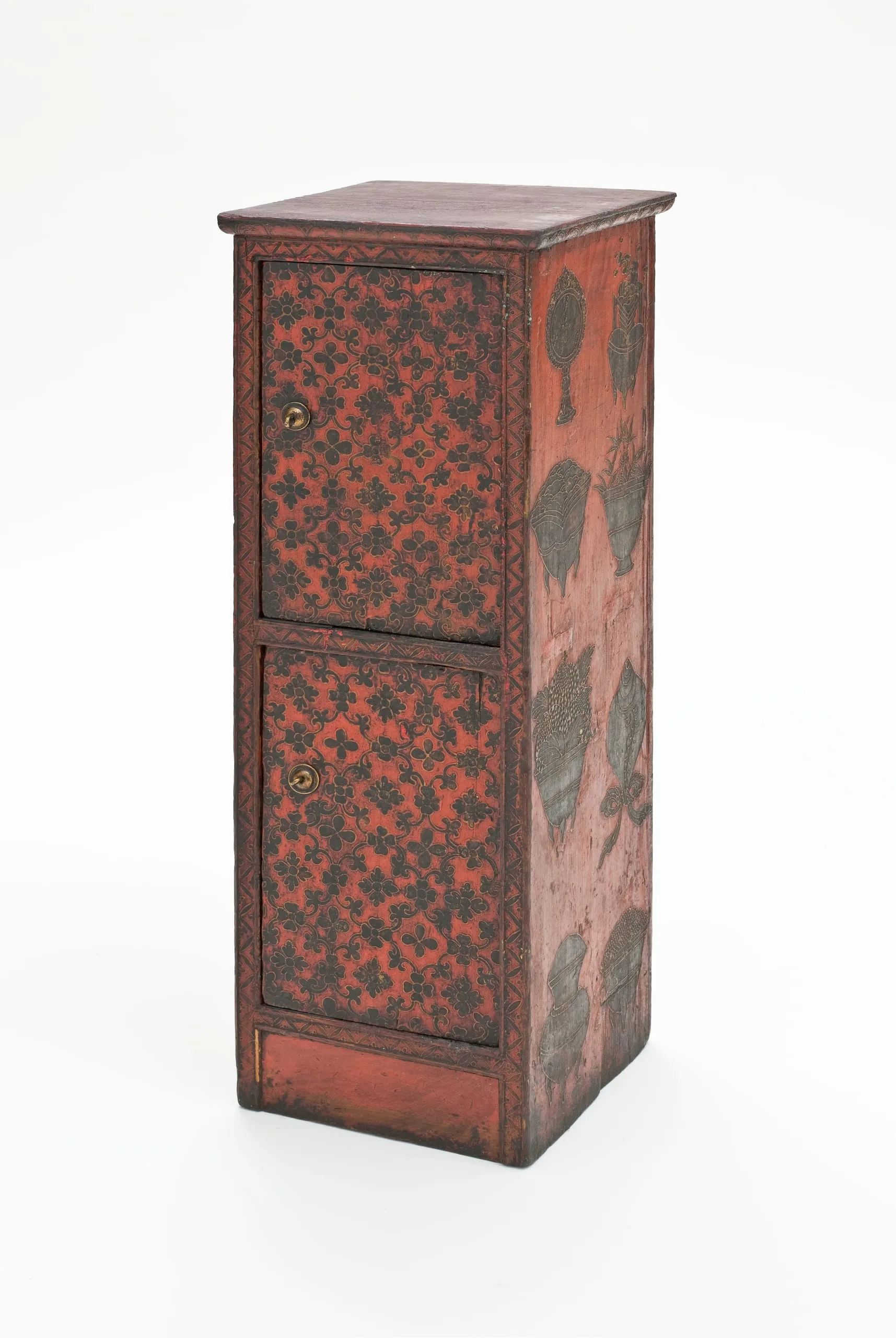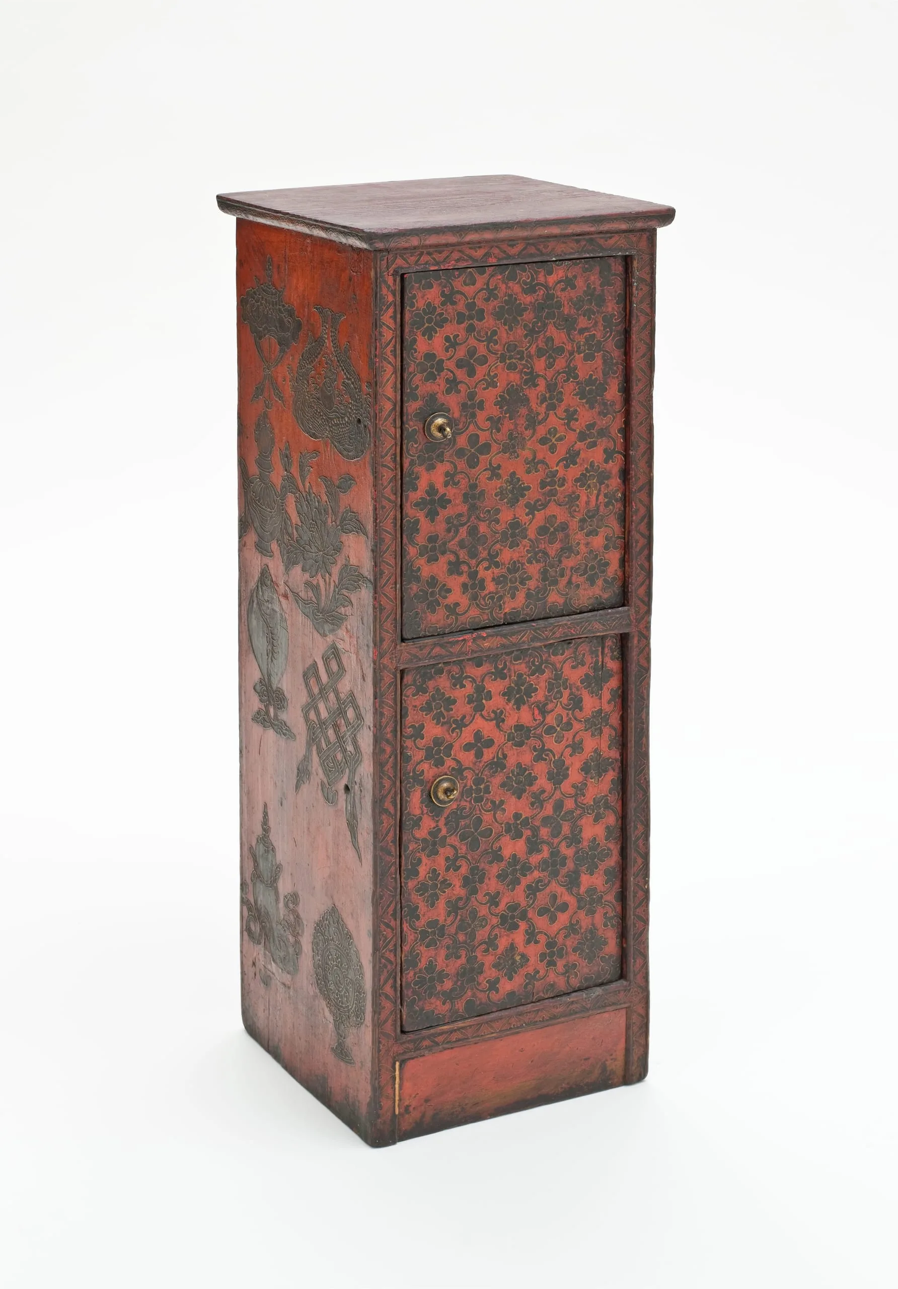 The two large compartments in the cabinet open with hinged doors on the front, which are decorated with a floral trellis pattern and framed with a diaper pattern. They would have been used for storage, perhaps the butter lamp when it was not in active ceremonial use. The sides of the stand are adorned with propitious motifs. On one side are the Eight Auspicious Symbols: lotus, endless knot, golden fishes, parasol, victory banner, golden treasure vase, white conch shell, and wheel of the law. On the other side are the Eight Auspicious Substances: mirror, precious medicine, yoghurt, durva grass, bilva fruit, right-spiraling white conch, vermilion powder, and mustard seed. The top is unadorned. See Robert Beer, The Encyclopedia of Tibetan Symbols and Motifs (Boston: Shambala Publications, 1999), pp. 171-193.
