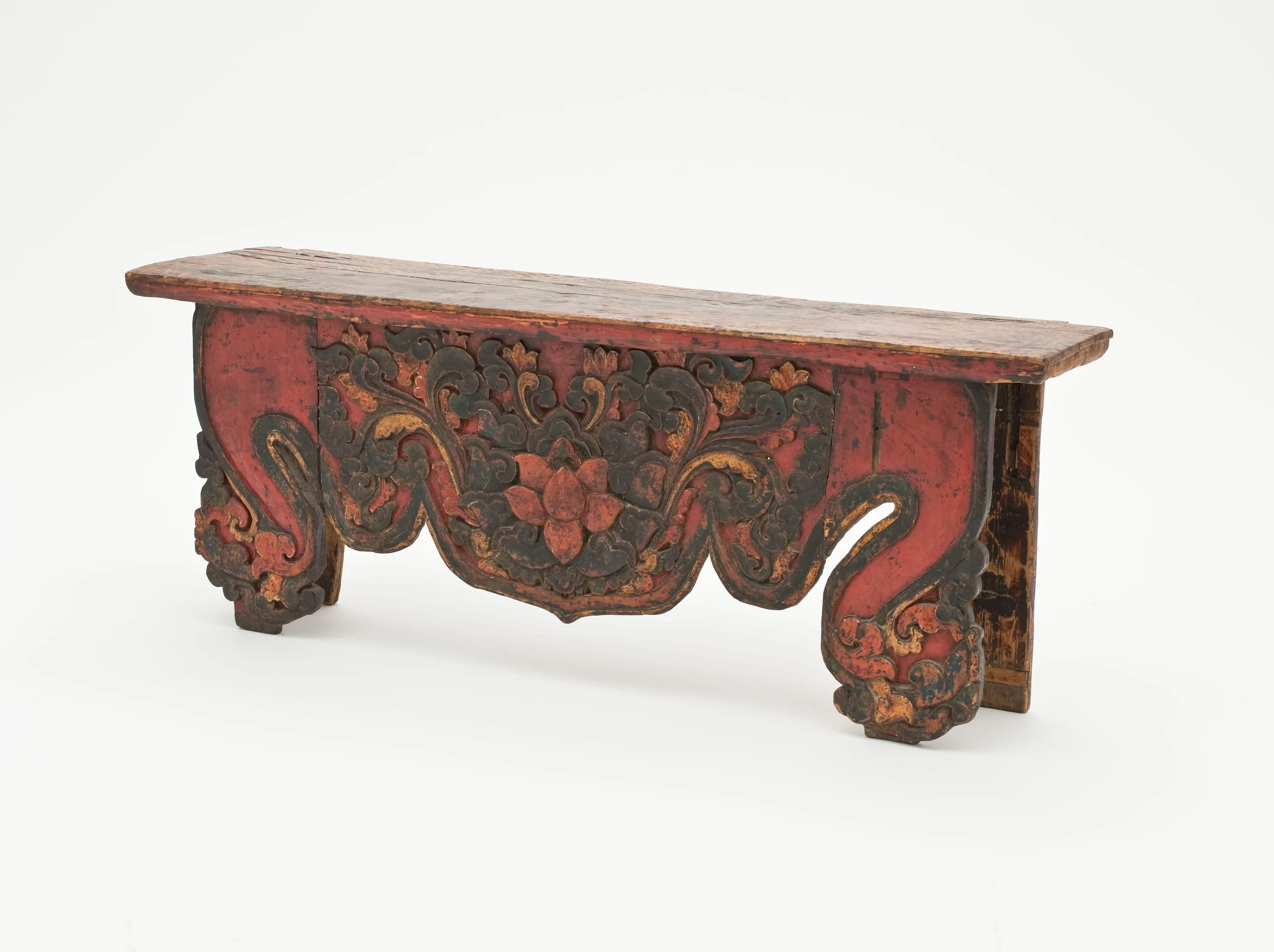 The apron of this table is adorned with a flaming wish-fulfilling jewel, symbolic of the Three Jewels (triratna) of Buddhism: the Buddha (the enlightened one), the Dharma (the teachings and path to enlightenment), and the Sangha (the community of practitioners). The precious gem rises from a lotus blossom with scrolling foliage. The ends of the table are cabriole legs with foliate bases. See David Kamansky, ed., Wooden Wonders: Tibetan Furniture in Secular and Religious Life (Pasadena: Pacific Asia Museum and Chicago: Serindia Publications, 2004), pp. 188-189, no. 13. See also M.2010.78.1, M.2010.78.8, and M.2010.84.