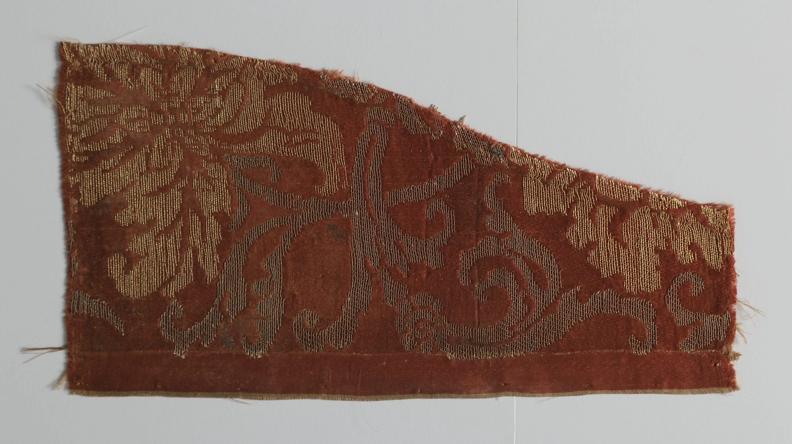 Irregularly shaped voided velvet textile fragment with brick-red pile and metallic gold woven ground, decorated with large scrolling foliate and palmette motifs