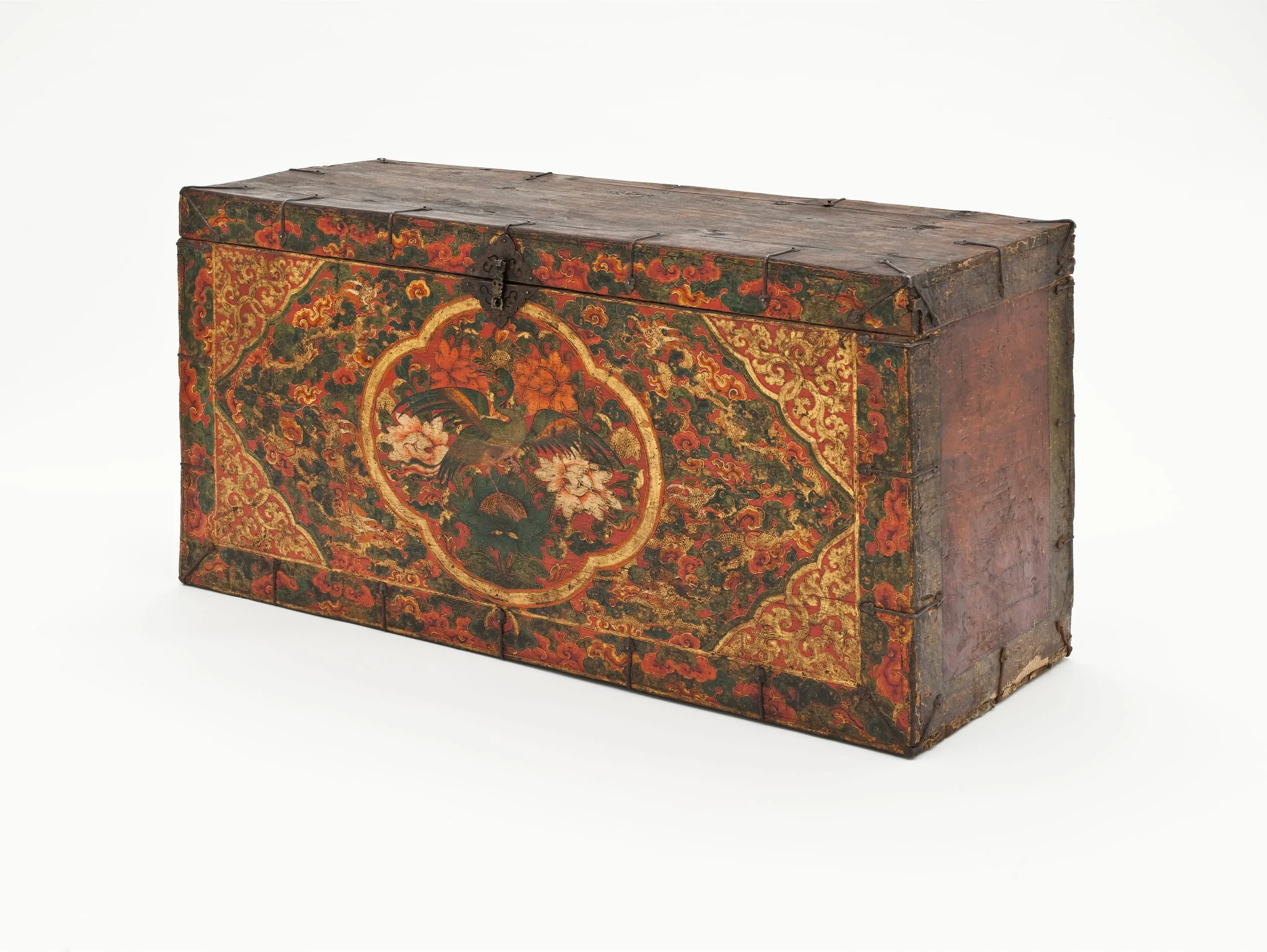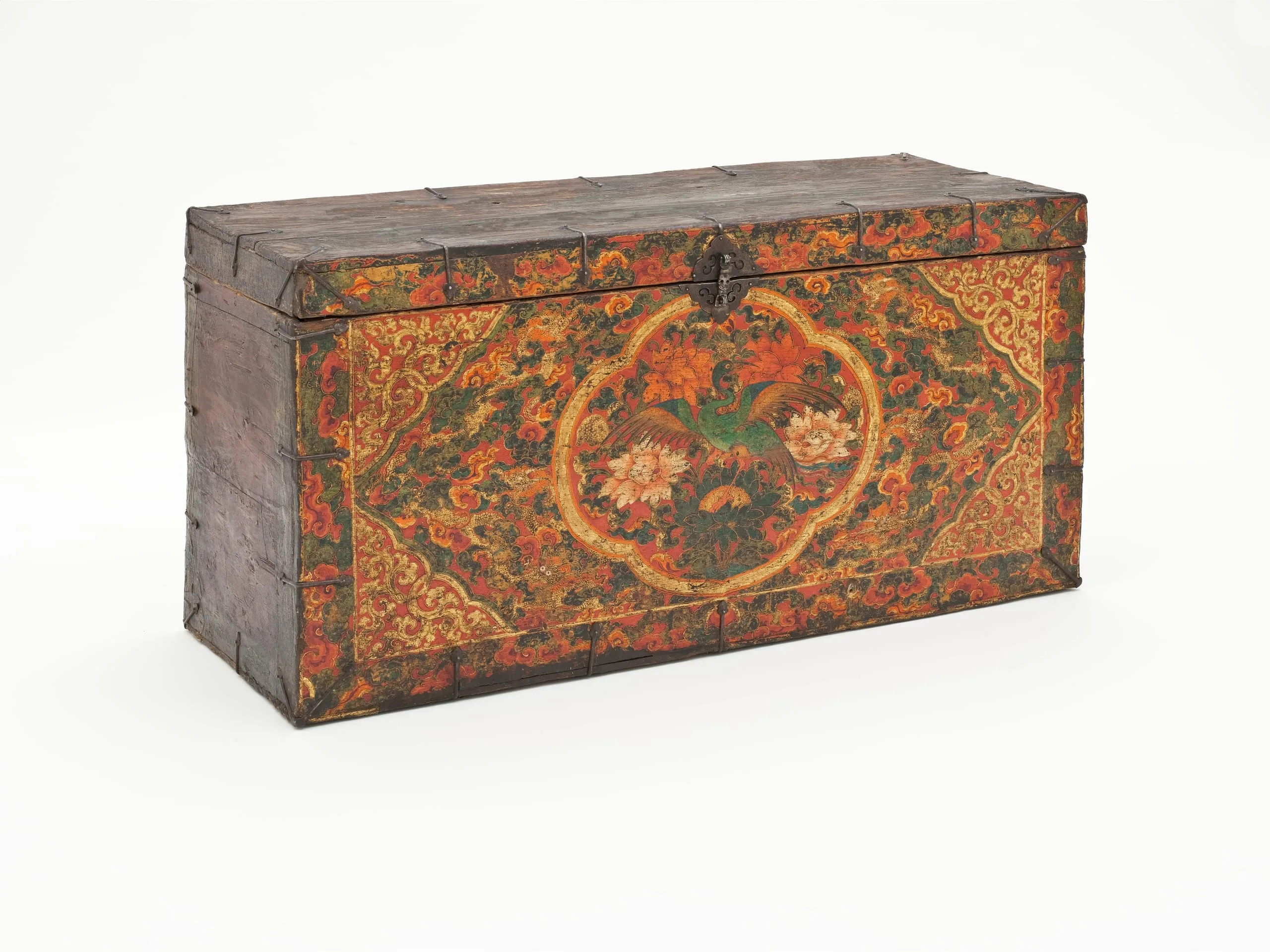 This trunk and its mate M.2010.81.4 feature central cartouches with mirror-image phoenixes standing on a multicolored lotus. Six gilt and gesso dragons in foliage surround each cartouche. The central panel has cloud-form corner designs in gold. The floral border around the central panel continues on the front edge of the trunk lid. It has reinforcement metal fittings and a locking hasp with ornate cloud-form clasp plates. See David Kamansky, ed., Wooden Wonders: Tibetan Furniture in Secular and Religious Life (Pasadena: Pacific Asia Museum and Chicago: Serindia Publications, 2004), pp. 266-267, nos. 87-88.